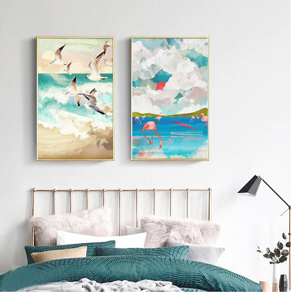 Плакат с изображением цветов, одуванчиков, заката, птиц, пляжа, тра...