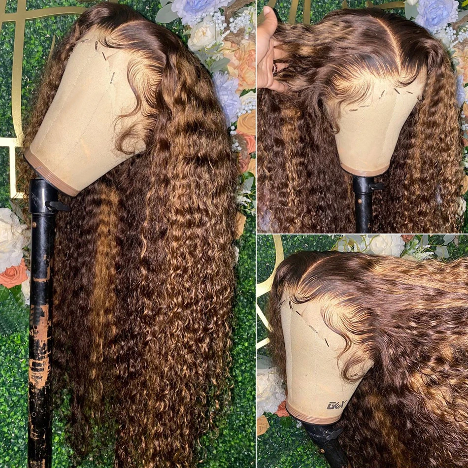 Яркий кудрявый 13x 4 кружевной передний парик медовый блонд парик 180% плотность бразильский Омбре коричневый цвет 4x4 закрытие парик для черных женщин