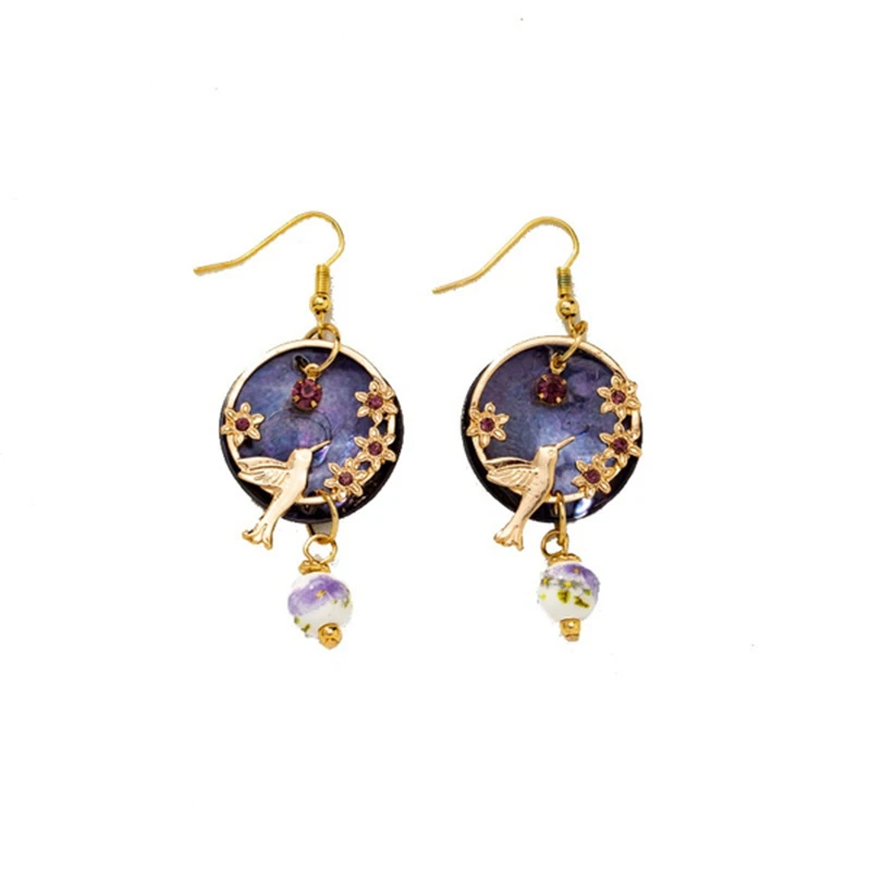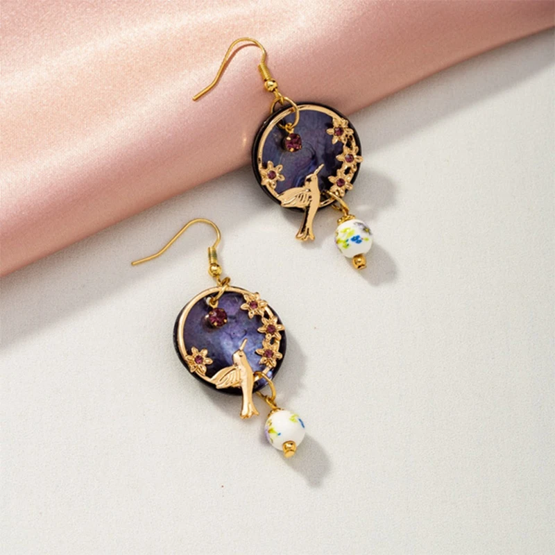 Винтажные серьги-подвески с фиолетовыми бусинами в виде ракушек золотого цвета, круглые серьги в форме цветка, птицы, крючок для женщин, ювелирные изделия для вечеринки, новинка 2021