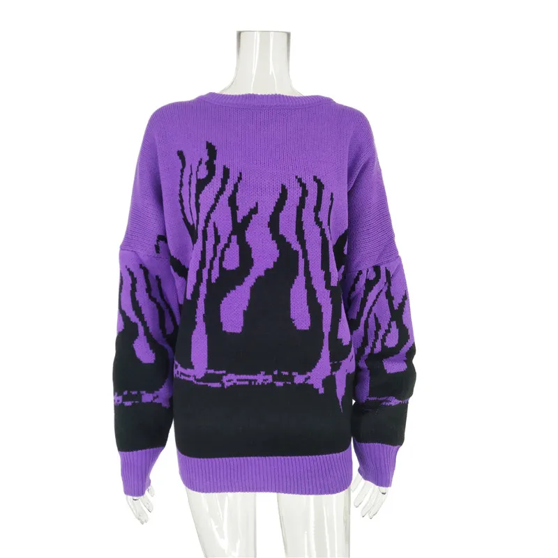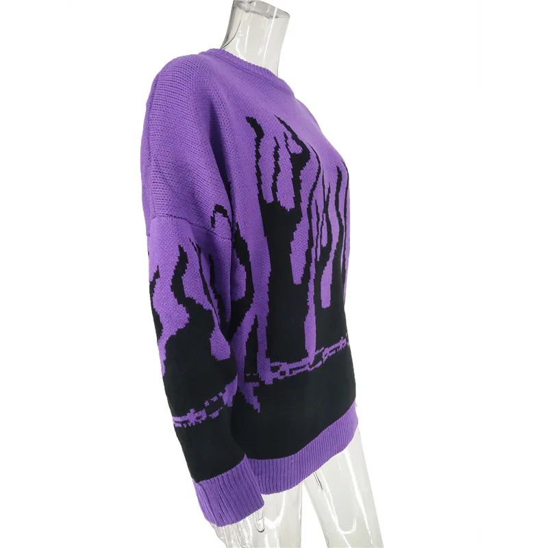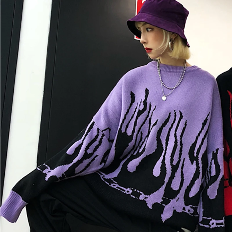 Свитер для пар в стиле Харадзюку, свитер в стиле хип-хоп с огненным пламенем, вязаный зимний мужской и женский наряд, Свободный пуловер, модные топы унисекс