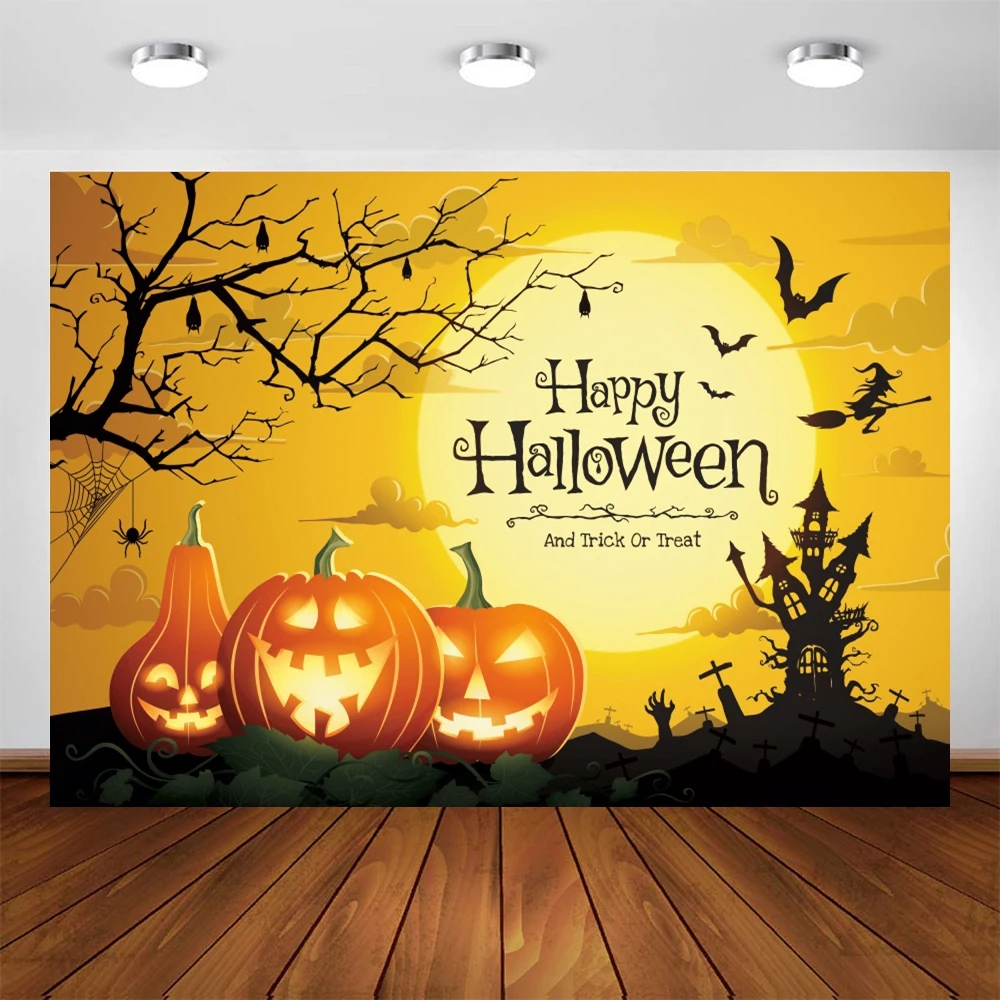 Фон для фотосъемки на Хэллоуин с изображением замка тыквы фонаря Луны ветвей кладбища надгробных камней