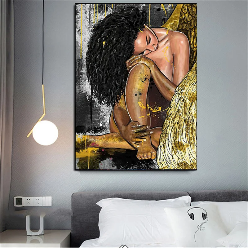 Картина маслом на холсте Девушка кудрявая с золотыми крыльями, плакаты-портреты, принты на стену, картина для гостиной, Современный домашний декор