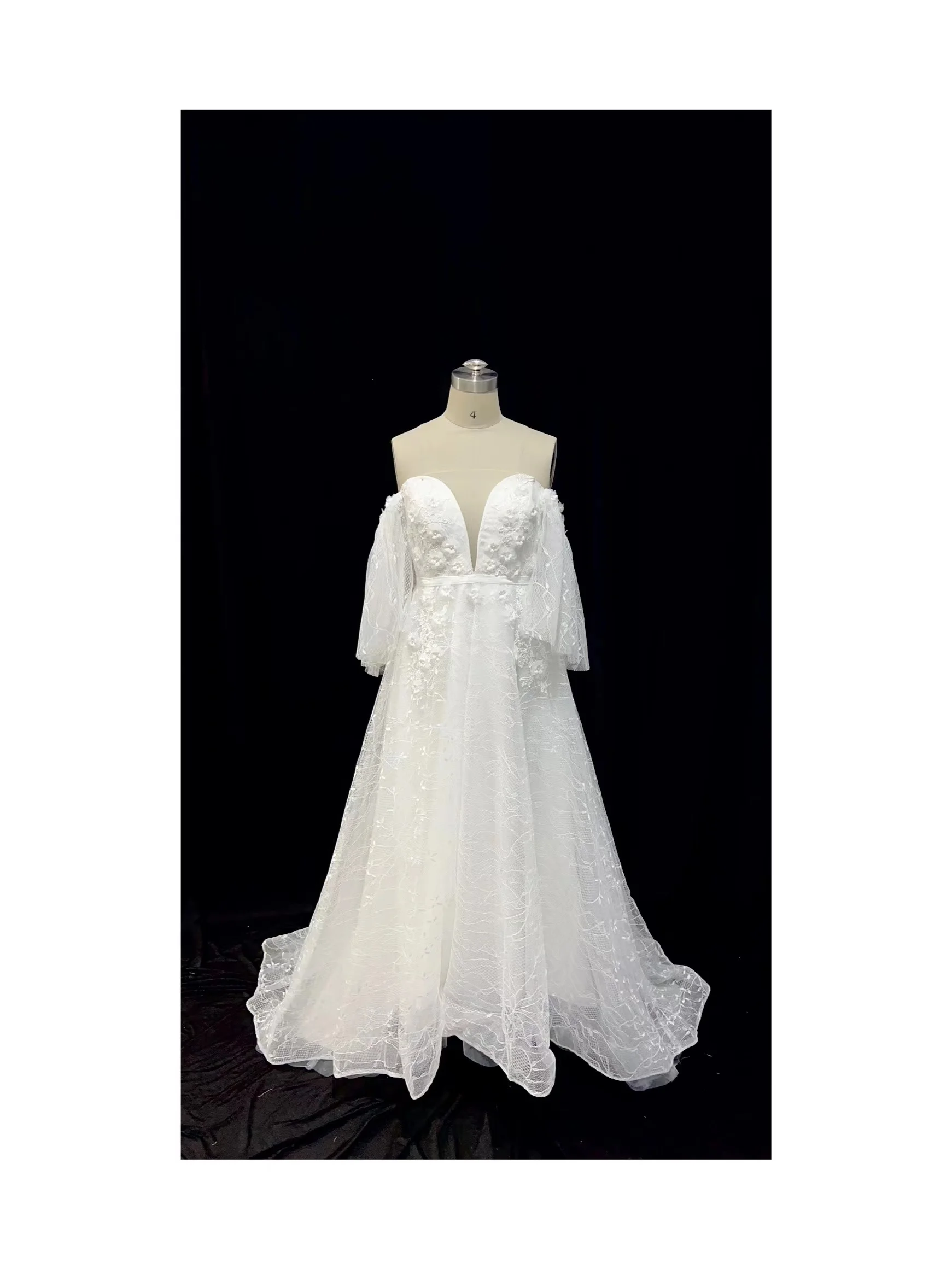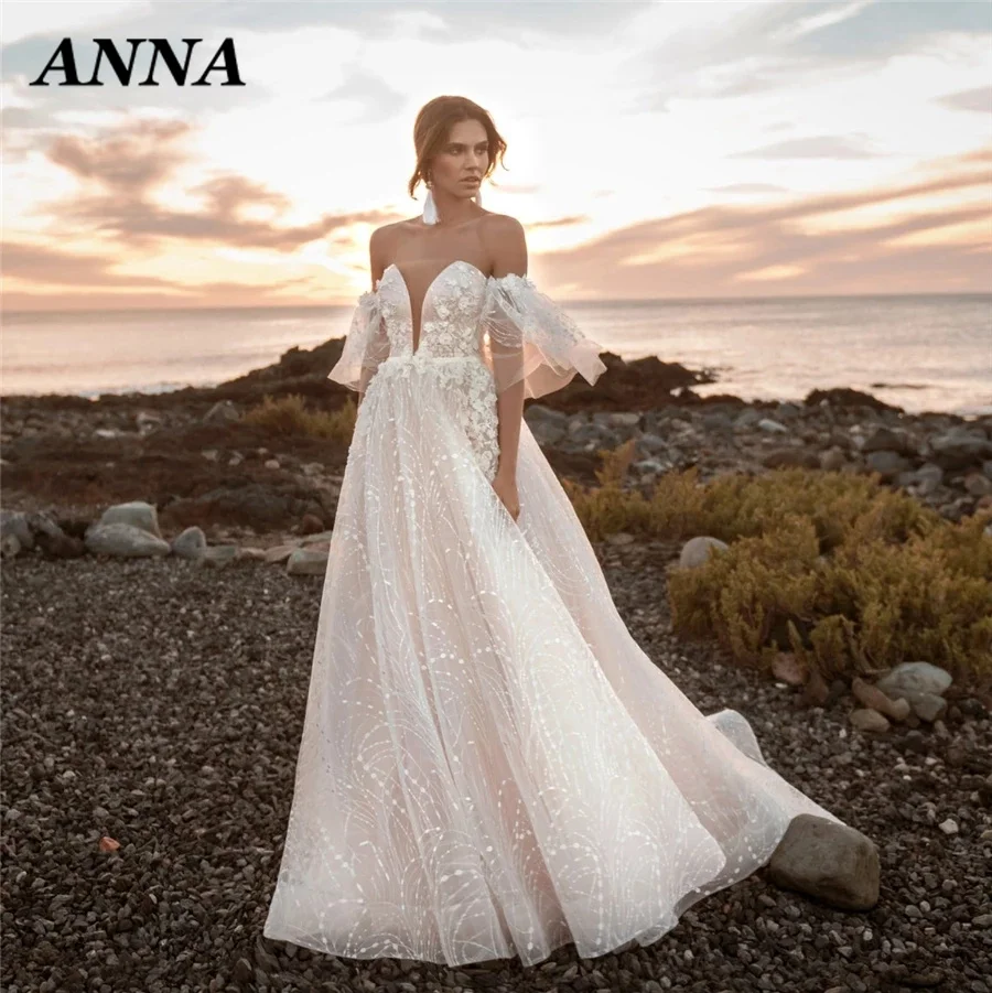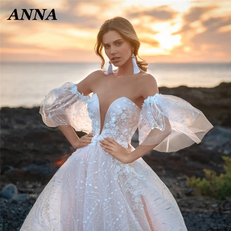 Женское длинное свадебное платье, Пляжное платье из тюля с открытыми плечами и пышными рукавами, ANNA-BEAUTY магазин, 2021