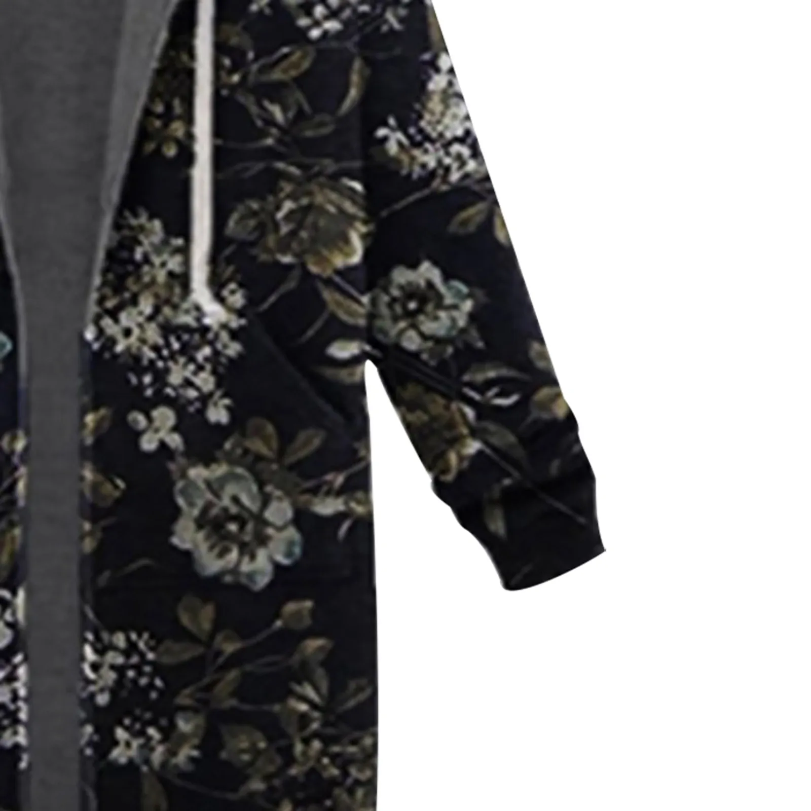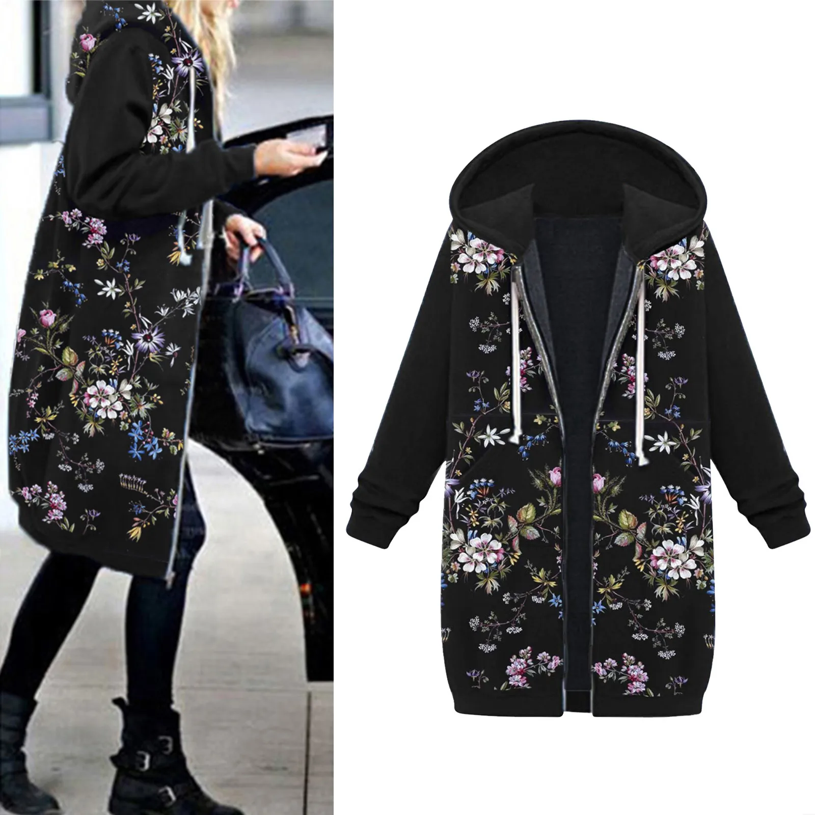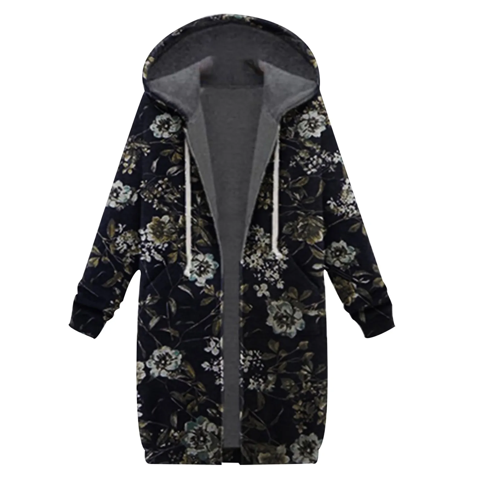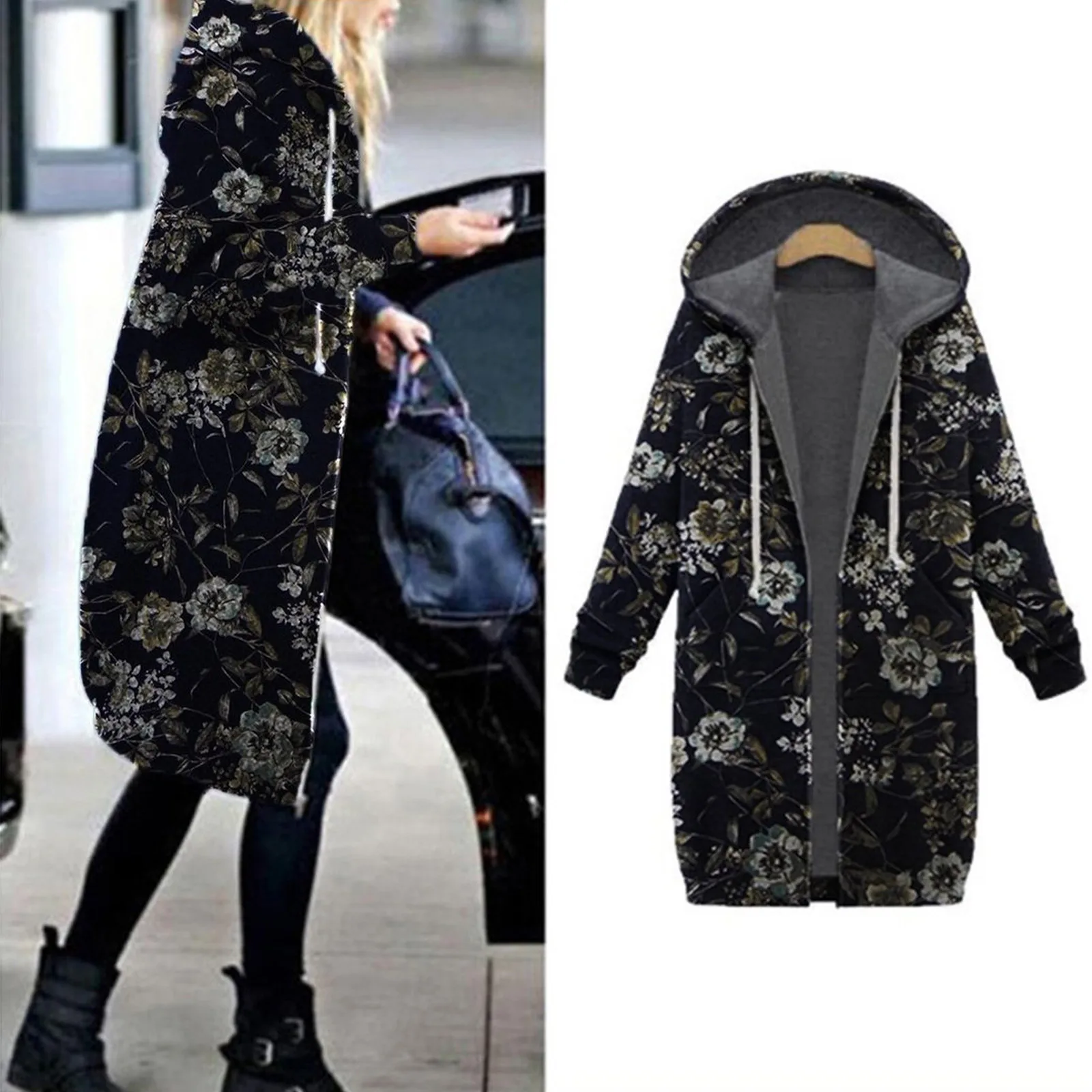 Винтажная куртка, женская зимняя теплая толстовка с капюшоном и цветочным принтом, кардиган из смеси хлопка на молнии, длинная верхняя одежда, Chaquetas De Mujer 2021
