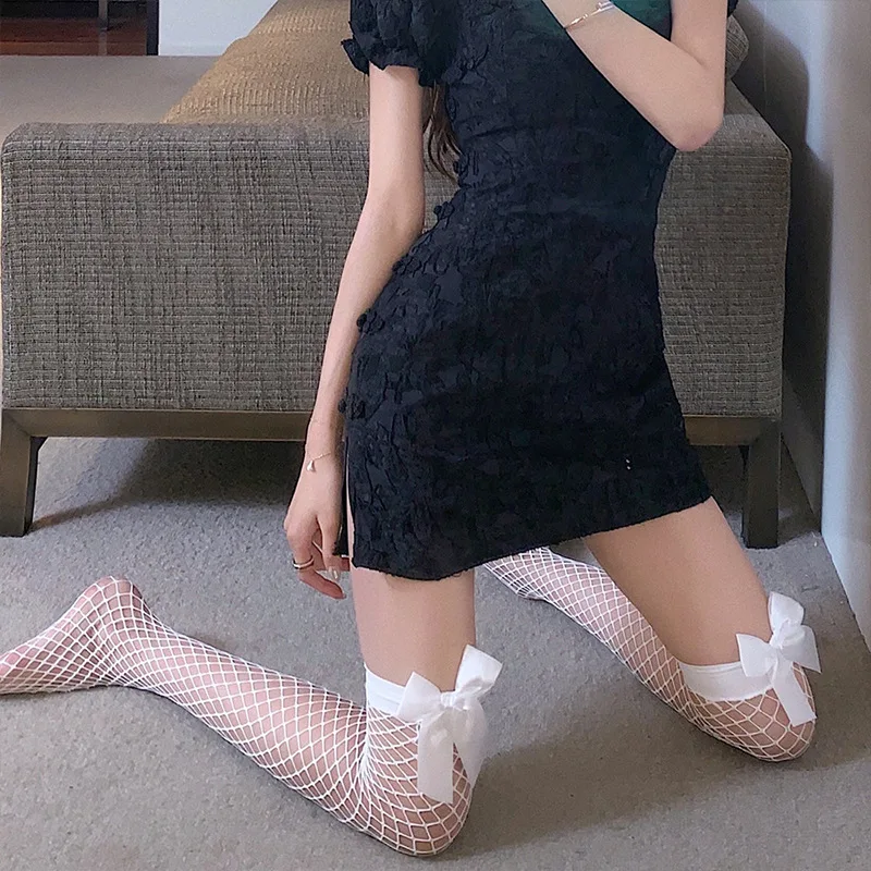 Сексуальные кружевные длинные чулки выше колена с бантом, милые черно-белые женские чулки в сеточку JK Lolita