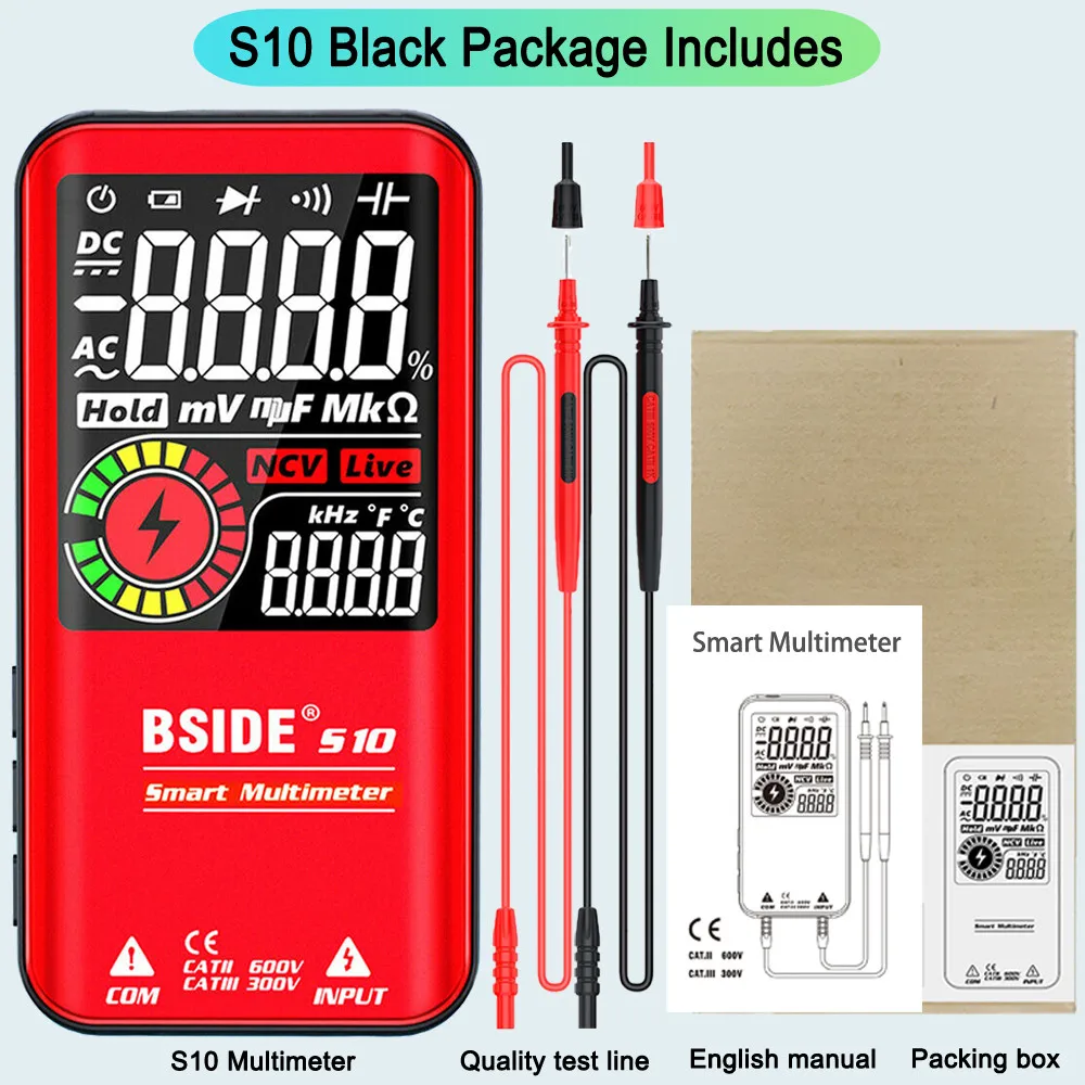 Продукты серии BSIDE S относятся к последнему поколению BSIDE бренда smart multimeters!Большой 3,5-дюймовый дисплей дизайн покинула мою превосходный пользовательский опыт для покупателей; Простой в использовании одной кнопкой переключения конструкция была признано покупателями; ультратонкий корпус очень легко носить с собой.Предоставьте 2 вида продукции на ваш выбор (S10 / S11).Изысканный внешний вид/надежная производительность/Полные функции могут удовлетворить потребности разных людей, и это очень подходит в качестве подарка.Спецификация: