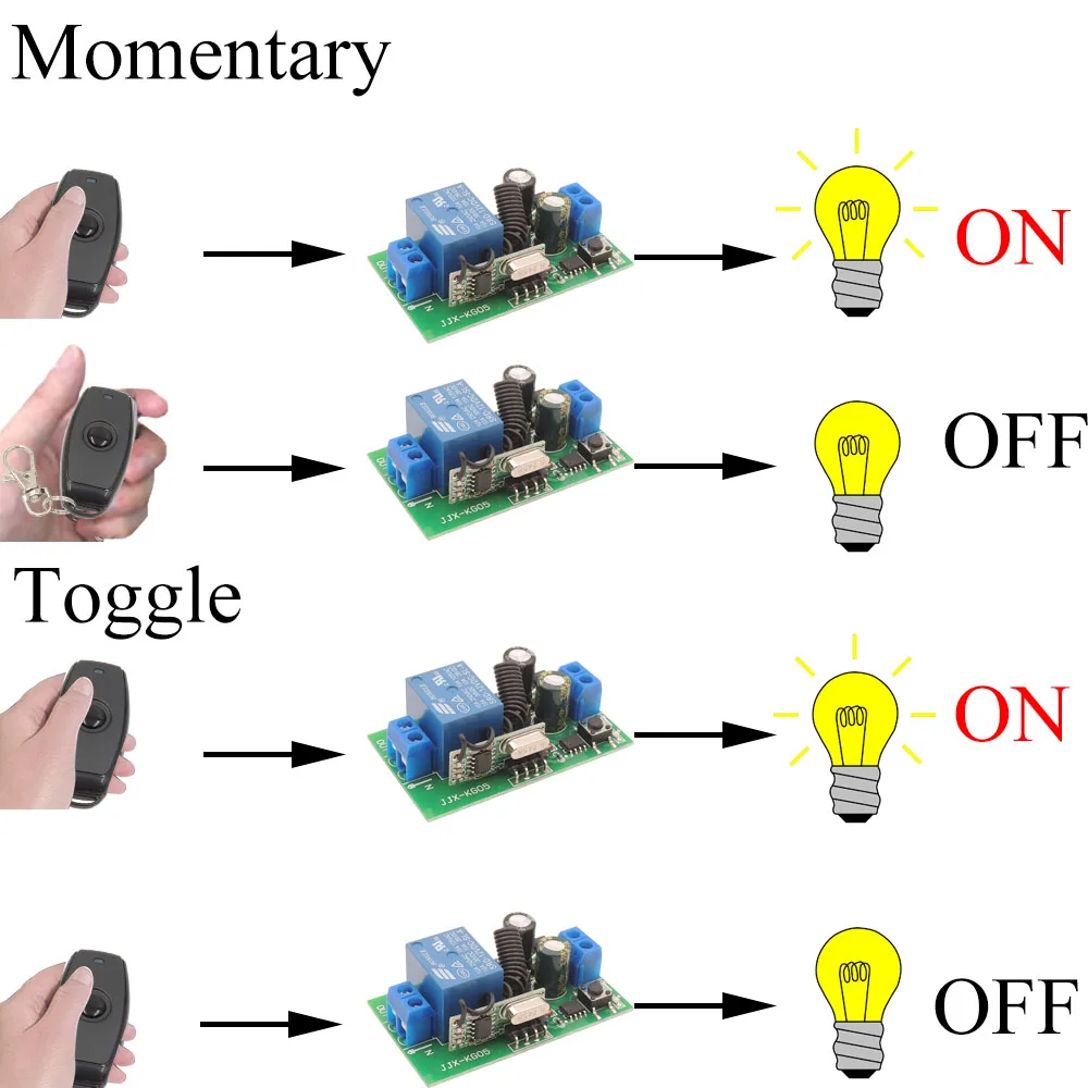 Два режима rf: momenatry,toggle и latchedМгновенный: Нажмите и удерживайте кнопку дистанционного управления, переключатель будет работать, кнопка отпускания, переключатель остановитсяПереключатель: Нажмите кнопку дистанционного управления, переключатель будет работать, нажмите ту же кнопку дистанционного управления снова, переключатель остановится