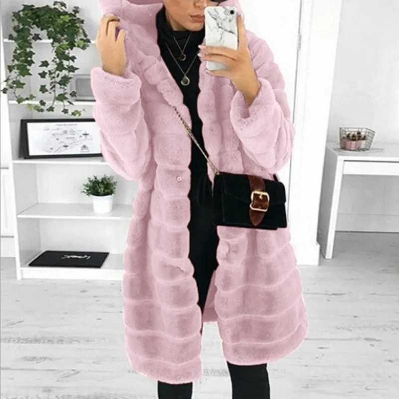 Женское теплое пальто с капюшоном, длинное зимнее пальто из искусственного меха с длинным рукавом