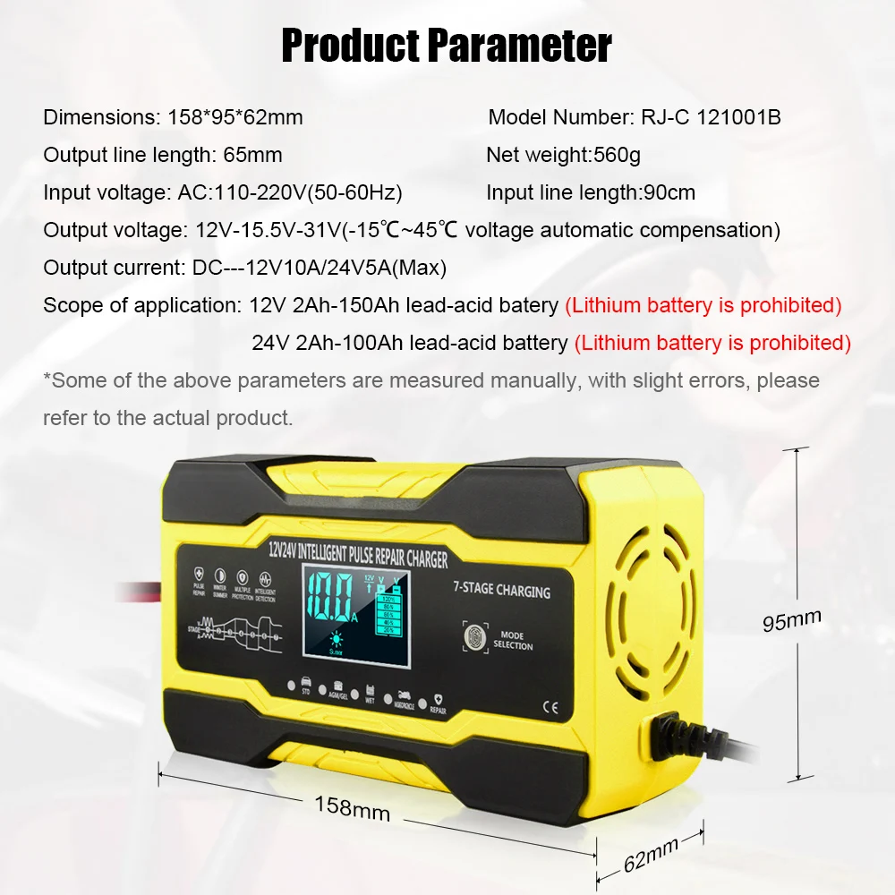 Зарядное устройство для автомобильного аккумулятора, 12 В, 10 А, 24 В, 5 А, импульсный ремонт, ЖК-дисплей, умная быстрая зарядка, глубокий цикл, гелевое свинцово-Кислотное зарядное устройство