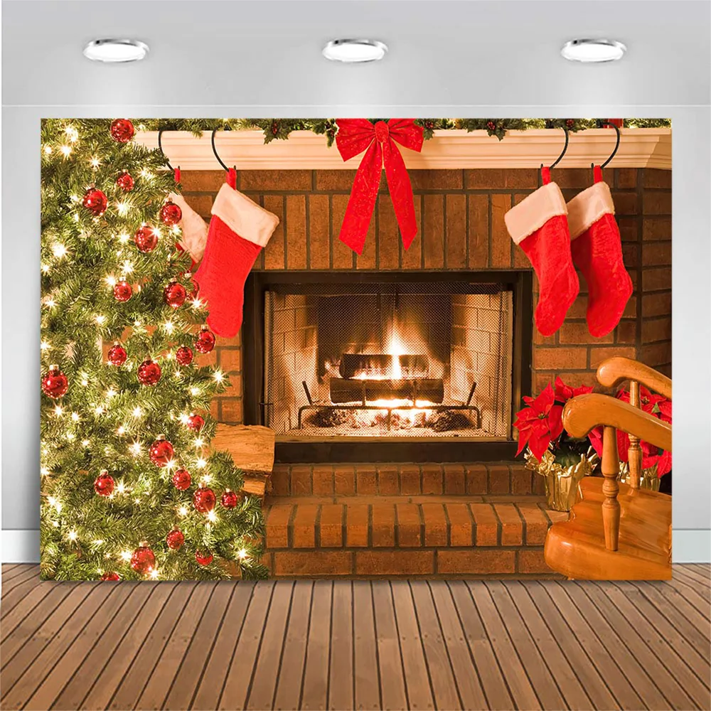 Фон для фотографирования новорожденных с изображением рождественской елки и камина Mocsicka