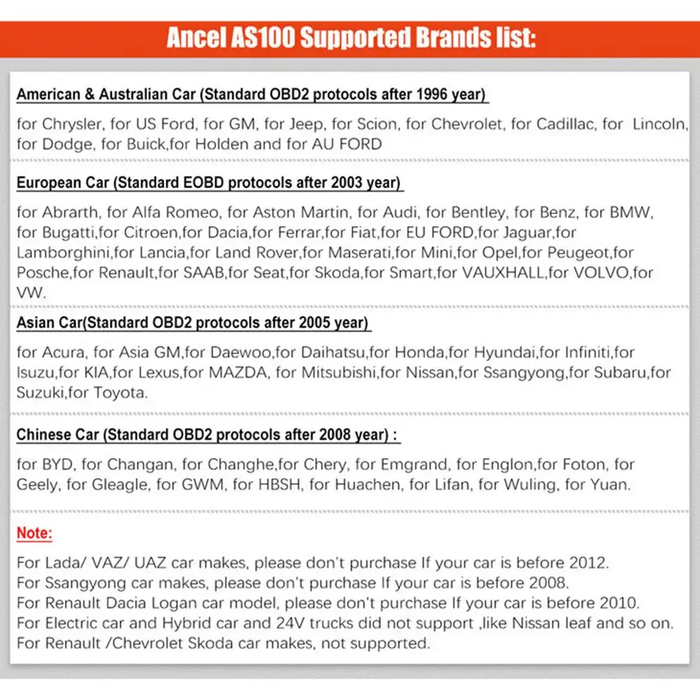 Несмотря на то, что продукт совместим с большинством автомобилей, но различные регионы поддерживают протокол OBD2 транспортного средства в разное время, или некоторые машины имеют особый дизайн, поэтому он может не совместим с некоторыми автомобилями, которые не поддерживают протокол OBD2. Особенно японский и корейский автомобильный бренд. И это устройство имеет только функции OBD2, не имеет специальных функций, таких как сброс ABS, сброс подушки безопасности. Пожалуйста, оставьте нам сообщение в формате ниже, мы ответим Вам в течение 8 часов.