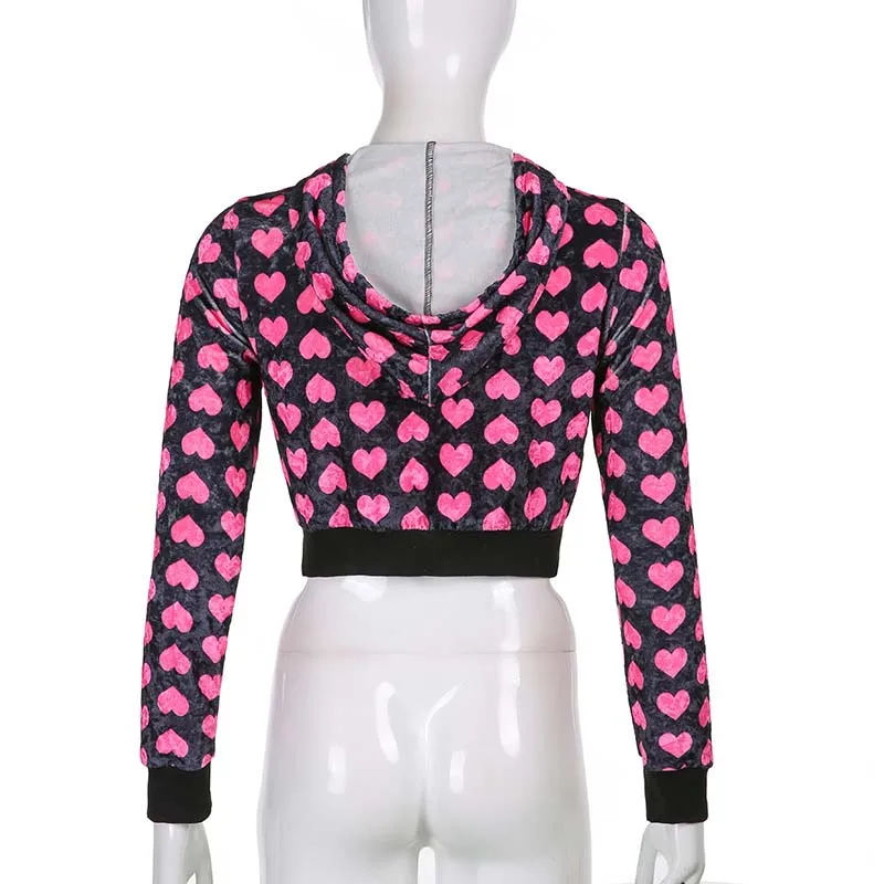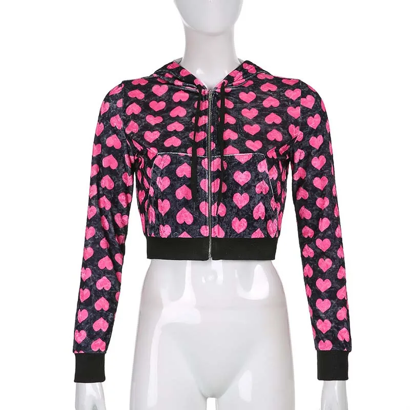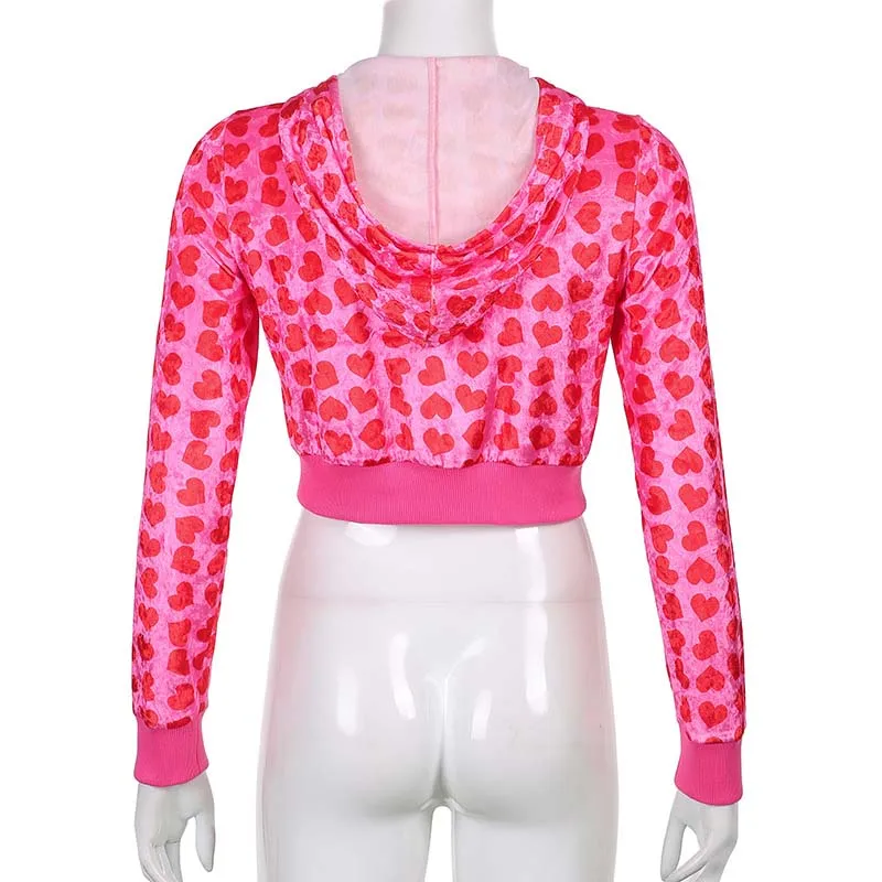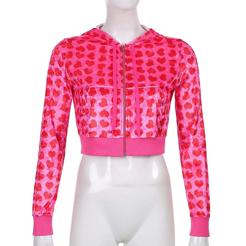 Осенние бархатные толстовки Y2K, женская укороченная Толстовка с принтом розового сердца, свитшот, Женская толстовка с длинным рукавом и молнией, куртка, 2021