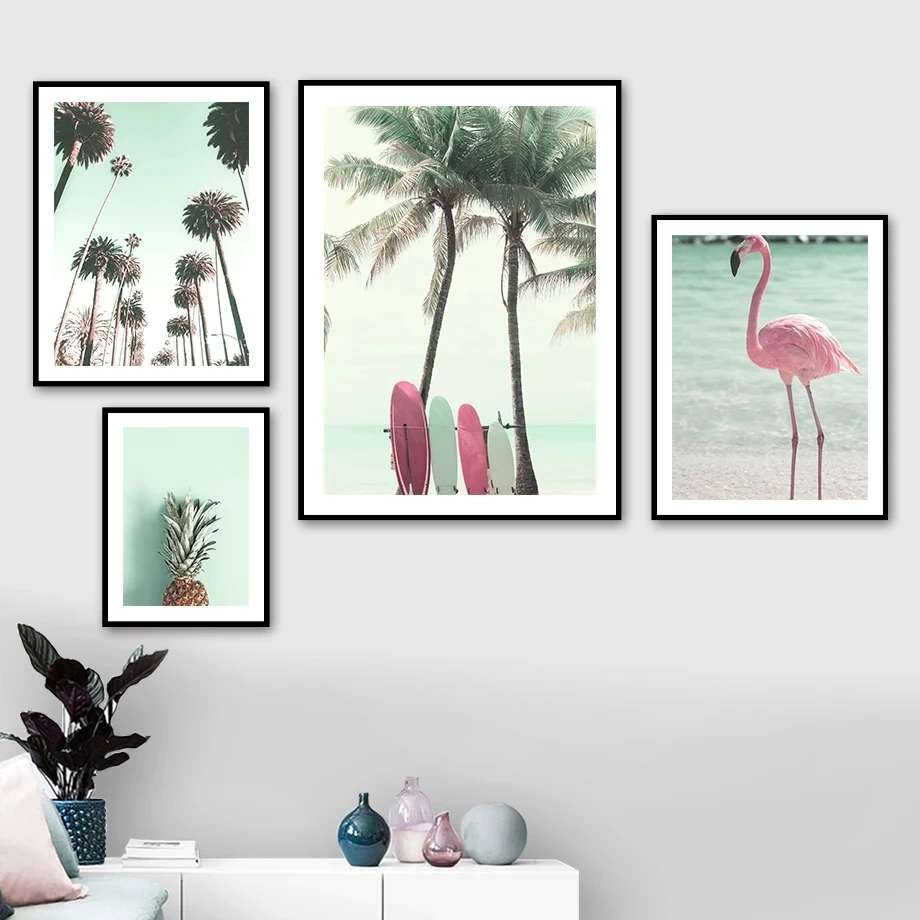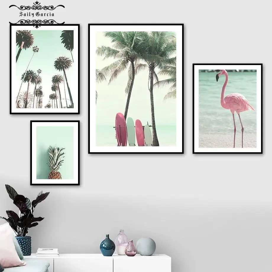 Постер и печать тропического Морского Пейзажа, доска для серфинга с пальмами и фламинго, настенная Картина на холсте, настенные картины в скандинавском стиле для декора гостиной
