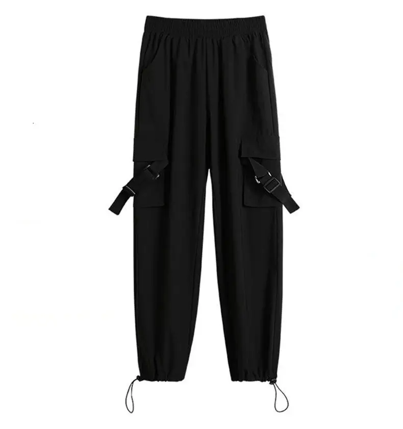 Женские свободные брюки-карго с эластичным поясом, уличная одежда в стиле хип-хоп, черные повседневные шаровары в стиле панк с карманами