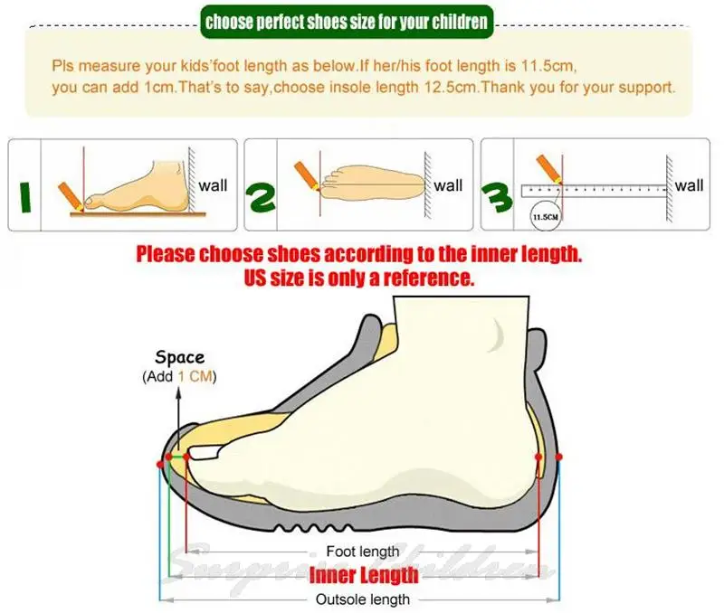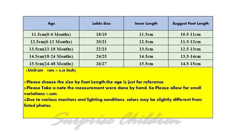 Age:6-12 Months ,Lable Size :20/21, Inner Length:12.5cm, Suggest Foot Length:11.5-12cmAge:12-18 Months ,Lable Size :22/23, Inner Length:13.5cm, Suggest Foot Length:12.5-13cmAge:18-24 Months ,Lable Size :24/25, Inner Length:14.5cm, Suggest Foot Length:13.5-14cmAge:24-48 Months ,Lable Size :26/27, Inner Length:15.5cm, Suggest Foot Length:14.5-15cm1inch = 2.54 cm 1cm = 0.39inch Manual measurement, please allow 1-3cm error.Warm Tips:1.Choice the Correct Size according to your Child Height2.Due to various monitors and lighting conditions, colors may be slightly different from listed photos.3.Please consider to buy a size up of sleepwear, because they're growing so fast at this age.4.If your child is above average,consider a bigger size because of the snug fit.