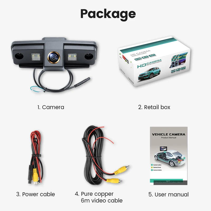 1. Камера заднего вида2. Розничная коробка3. Кабель питания4. Видеокабель из чистой меди 6 м5. Руководство пользователя