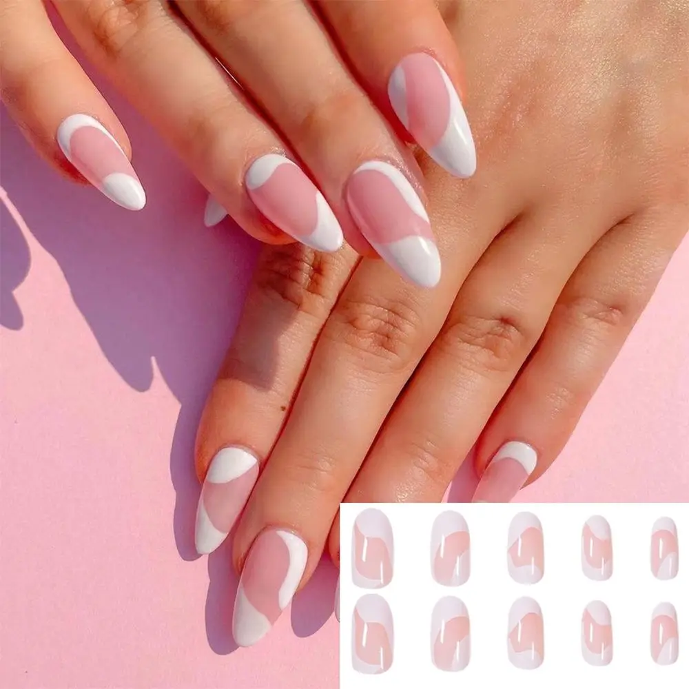24 шт розовый белый волнистый стиль накладные ногти короткая форма миндаля накладные ногти полное покрытие Искусственный Дизайн ногтей Советы пресс на ногтях