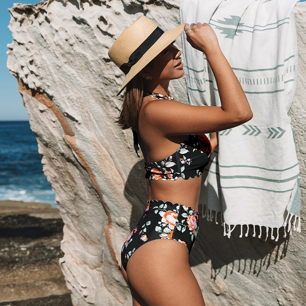 Купальник бикини женский желтый с цветочным принтом и высокой талией