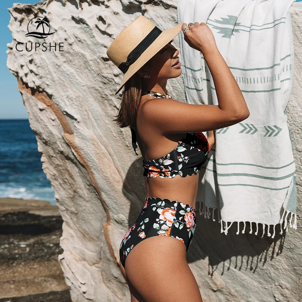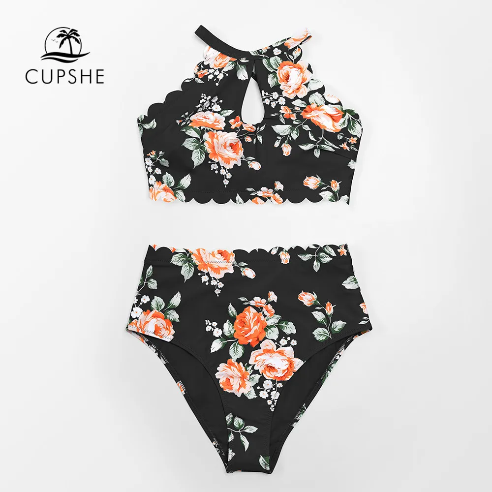 Женский купальник-бикини CUPSHE, черный купальник с высокой горловиной и бретелькой через шею, 2021, пляжный купальный костюм