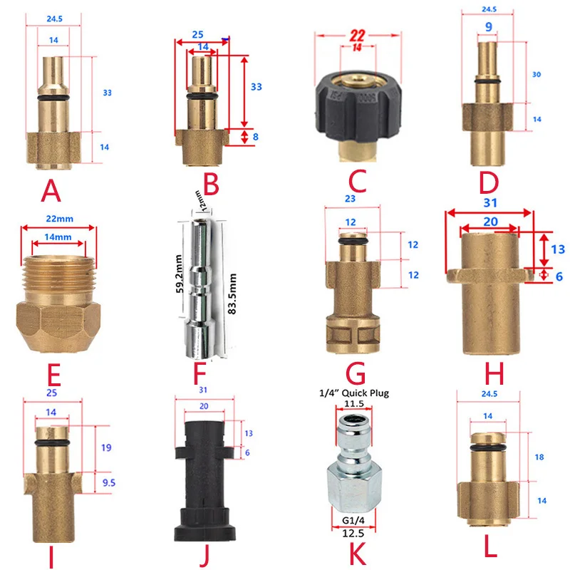 A. Для Lavor/некоторых Hammer Flex/некоторых Interskol / Sterwins / Vax/некоторых чемпионов/мастеров/Briggs stratton Мойка под давлением;Б. Для некоторых моек высокого давления Huter / Anlu / Kolner;C. Для некоторых моек высокого давления Karcher Pro HD/ HDS (старый пусковой пистолет со стандартным выходом M22);D. Для AR Blue Clean/ Black Decker / Michelin/некоторые из Interskol/некоторые из Greenworks/ Makita / Mac Allister/большинство моек высокого давления Bosch;E. Для Kranzle / BOSCH GHP/водяной пистолет с M22-Female мойкой давления;F. Для Nilfisk Kew/некоторые из Karcher HD Профессиональная мойка давления;G. Для некоторых Bosch (старых) / Greenworks US / Husky / Portland/некоторых молотков гибкого давления шайбы;H. Для мойки под давлением Karcher K-Series (материал адаптера: металл);I. Для Nilfisk / STIHL / HUSQVARNA / Gerni/некоторых моек под давлением Greenworks;J. Для некоторых моек высокого давления Karcher Pro HD/ HDS (новый пусковой пистолет с легкой силой);K.1/4 "Быстрый штекер, который является популярный соединитель в Северной Америке.L. Для Elitech/некоторых Interskol / YILI/некоторых Huter/некоторых Patriot/ Daewoo/ Bort / Pressure Joe / Sun Joe Мойка под давлением;Металлическая насадка с 5 быстрыми наконечниками для Karcher K1 K2 K3 K4 K5 K6 K7 очистители высокого давления
