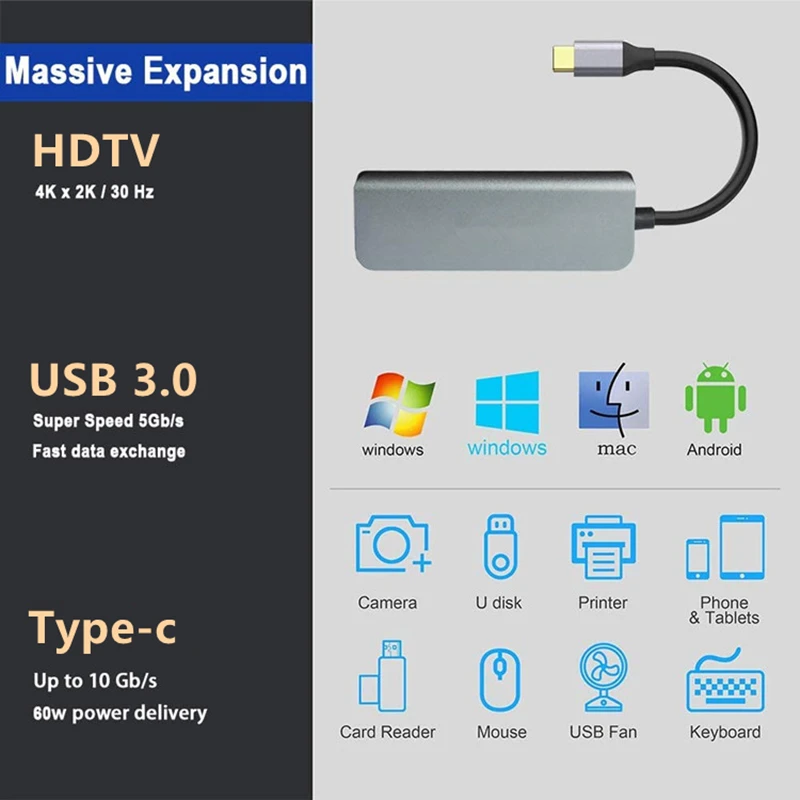 Тип 1: Type-C к HDMI/ USB 3,0*2/ USB C;Тип 2: Type-C к HDMI/USB-C/USB 3,0*3;Тип 3: Тип C к HDMI/USB-C/USB 3,0*2/SD/TF;Тип 4: Тип C к HDMI/USB-C/USB 3,0*3/SD/TF.Характеристики выходного интерфейса:1.USB 3,0: скорость передачи данных 5 Гбит/с;2.HDMI: 4K(3840*2160 @ 30 Гц);3.USB-C: заряжаемая (PD), 20V/3A, max 87 Вт;4.SD/TF: SD(HC)/SD XC/MMC/Micro SD(TF), возможности хранения данных. Совместимые элементы: