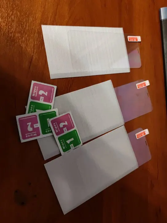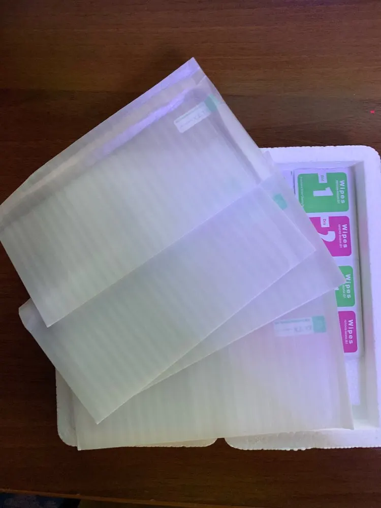 Товар прибыл в хорошем состоянии. На это ушло около 3 недель. В комплект входят 4 протектора (на фотографиях только 3, потому что 1 я уже надел на мобильный, хахаха). У каждого протектора есть свои салфетки и жидкость, которые нужно положить в конец после приклеивания экрана. Я РЕКОМЕНДУЮ ЭТО!