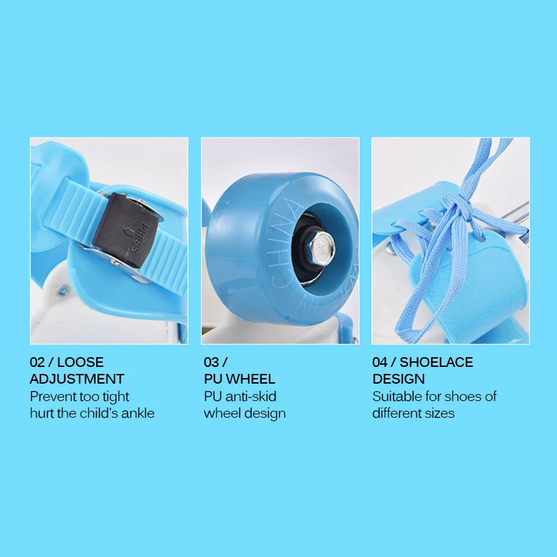 Обувь для катания на коньках может быть легко отрегулирована по длине с помощью винтов с закручивающейся подошвой, изменив размер, отрегулирув веревку для обуви и пряжку на лодыжке