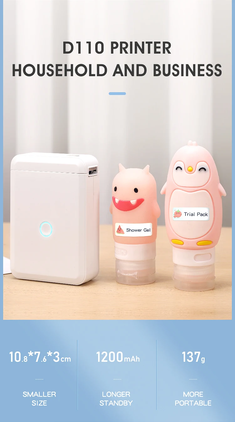 Niimbot D110 bluetooth label printer●Material: ABS●Battery-capacity: 1200mAh●Resolution: 203dpi●Item size: 108 * 76 * 30mm●Package size: 128 * 95 * 38mm