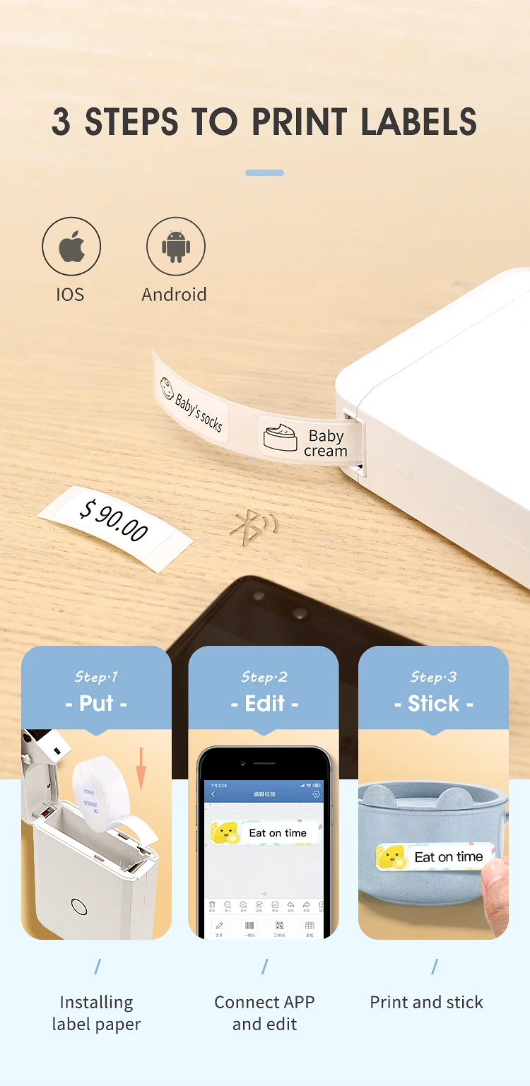 Wireless design, supports long distance printing. The wireless distance is up to 10m. Direct thermal, no ink, toner, or ribbons. Supports all major label formats: price, date, size, weight, name, and so on. Versatile, easy to use. Mini and lightweight, convenient for you to carry. 1200mAh battery-capacity supports long time use.