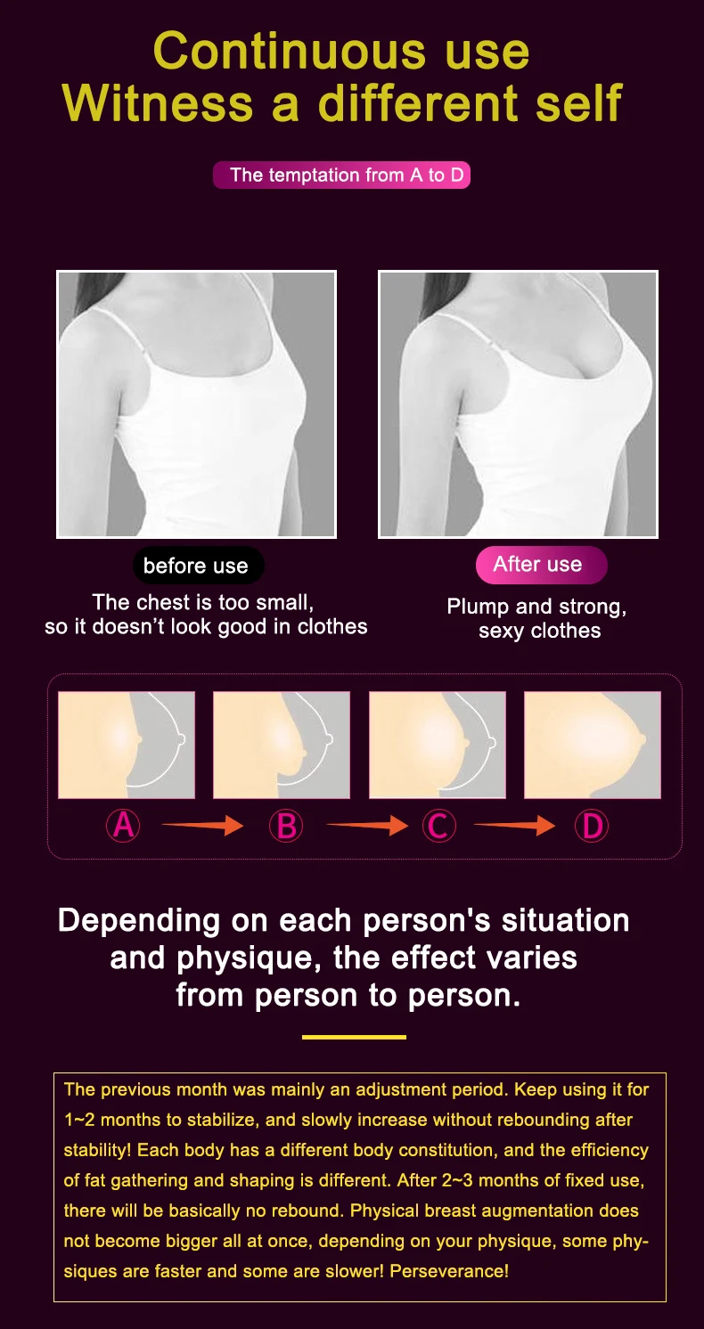 Описание:Название продукта: вакуумная чаша-насос для увеличения грудиТип: насосМатериал: АБС-пластикЦвет: прозрачныйФункция: Увеличение при помощи массажа женской груди и ягодицПродукт состоит из чашки, всасывающего насоса, соединительной трубки. Нет необходимости в электричестве.Характеристика:1. Инструмент для красоты груди с двумя чашками использует вакуумное давление для создания отрицательного давления, которое имитирует биологический ритм человеческого тела и поглощает его на теле. В то же время, он автоматически сосет и выпускает грудь, чтобы производить ритмичные ступенчатые аэробные упражнения для стимуляции переднего гипофиза, эстрогена, гормона роста и гормонов. Секреция, так что грудь быстро накапливает жир, укрепляет мышцы груди и укрепляет Связки, поддерживающие грудь. Кинетическая энергия может способствовать циркуляции крови в груди, увеличить блеск и сделать грудь твердой и пухлой. Сильный и гибкий.2. Первый месяц был главным образом период корректировки. Продолжайте использовать его в течение-2 месяцев для стабилизации и Медленно увеличивайте без восстановления после стабильности! Каждое тело имеет различные формы тела, и эффективность сбора и формирования жира отличается. После 2-3 месяцев фиксированного использования в основном не будет отскока. Физическое увеличение груди не становится все больше сразу, в зависимости от вашего телосложения, некоторые физики быстрее, а некоторые медленнее! Упорство!Ответ на вопрос:1. Каковы преимущества двойных чашек?Две чашки одинакового размера, которые могут держать две груди одного размера.2. Достаточно ли сильное всасывание?Разработанный с искусственной механикой, он не только имеет достаточную мощность всасывания, но также очень удобен и приятен.3. Будет ли это вредно для использования?Конечно, нет, мы используем высококачественные материалы, чтобы обеспечить приятный для кожи опыт.
