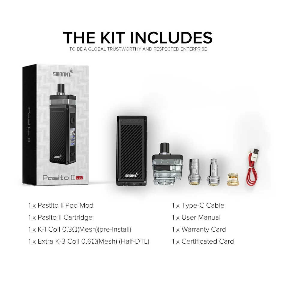 Pasito II Kit-это система pod mod, которая отличается элегантным внешним видом, компактным размером и удобным захватом. Он состоит из картриджа емкостью 6 мл и мода емкостью 2500 мАч. Оба они достаточно большие, чтобы обеспечить длительное испарение. Что касается картриджа, он имеет большое видимое окно, чтобы четко показать уровень сока. Применяется независимая система потока воздуха сверху и боковой прорезь для заправки во избежание утечки. Кроме того, в нем используется адаптер Pasito II 510 для совместимости со всеми видами распылителей, для чего требуется высококачественный вейпер. Кроме того, он совместим со всеми катушками Pasito и Knight 80 и катушками K3 Ом Half-DTL новой конструкции, что позволяет вам испытывать различные испарения. Что касается мода, то он может вырабатывать максимальную выходную мощность до 80 Вт. Оснащен 2,4-дюймовым TFT-экраном для отображения данных о вейпинге, он также поставляется с 5 различными цветными темами на ваш выбор. Кроме того, Доступно 4 режима: режим VW, режим DVW, режим байпаса и режим TC. Более того, он имеет порт Type-C для быстрой и безопасной зарядки.