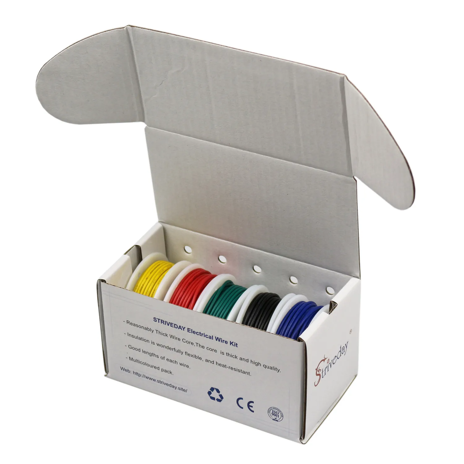 50m/box 30/28/26 AWG 10 meters of all colors UL1007 wire tinned copper wire kit 5 colors DIY30m/box 24/22/20 AWG 6 meters of all colors UL1007 wire tinned copper wire kit 5 colors DIY25m/box 18 AWG 5 meters each Two colors UL1007 wire tinned copper wire kit 5 colors DIY Color: box 1 red/green/blue/yellow/black box 2 orange/gray/purple/brown/white Length: 30/28/26awg 10 meters per roll Total 50 meters 24/20AWG 6 meters per roll / 30 meters total 18AWG 5 meters per roll / 25 meters total
