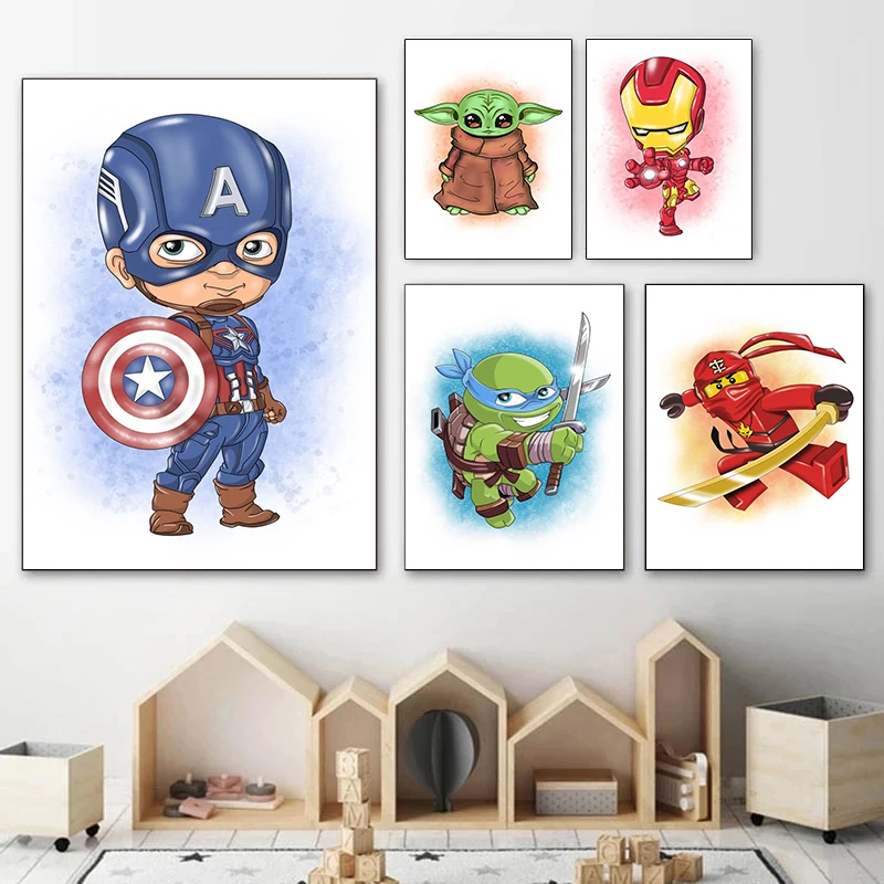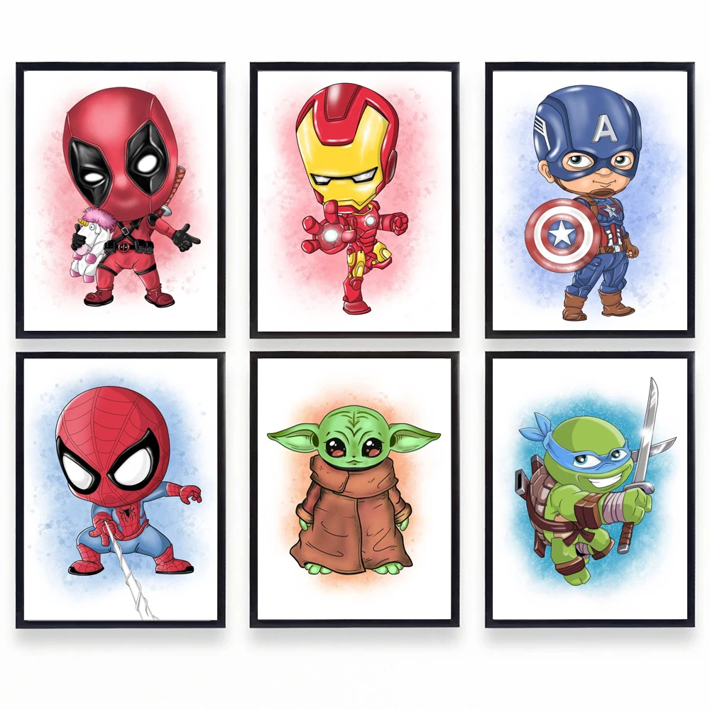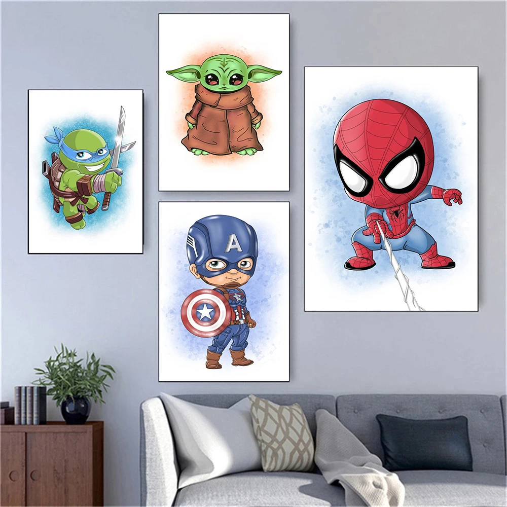Постеры с героями мультфильмов Marvel Мстители, супергерой, Человек-паук, йода, Картина на холсте, печать на стене, Картина на холсте, декор для детской комнаты, подарок