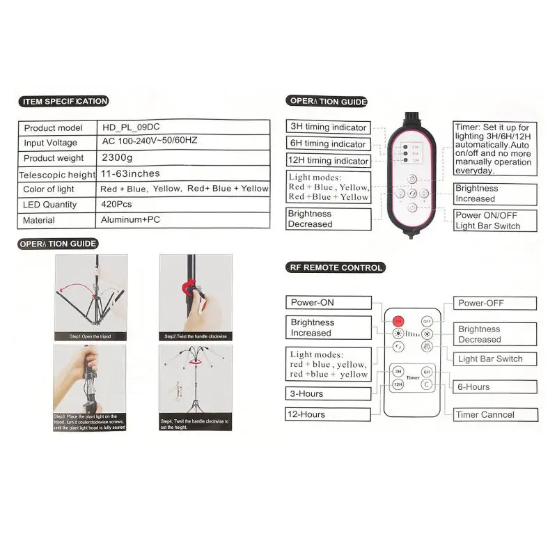 Квадратный четырехтрубный растительный светильник * 1 комплект, телескопический Треугольный Кронштейн * 1, европейский стандартный адаптер * 1, кнопочный пульт дистанционного управления * 1, руководство * 1