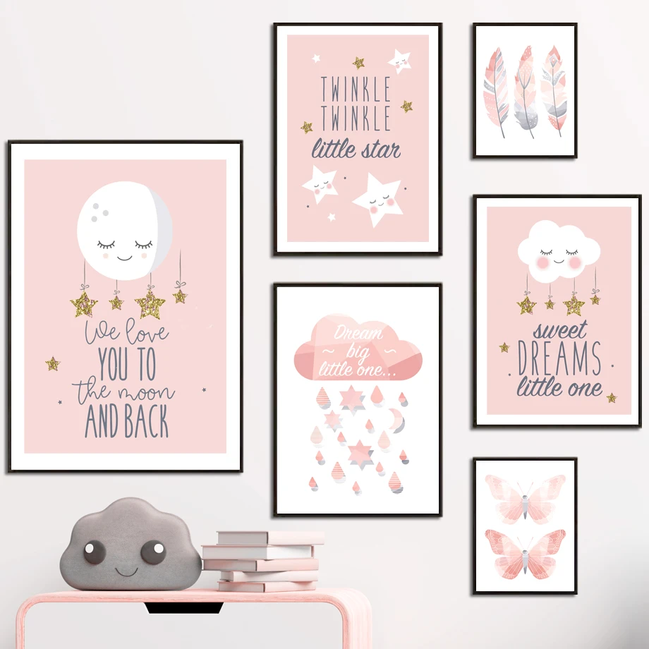 Плакаты мечты, цитаты, рисунки в скандинавском стиле, розовые перья, облака, звезды, Луна, Картина на холсте, настенные картины для декора детской комнаты