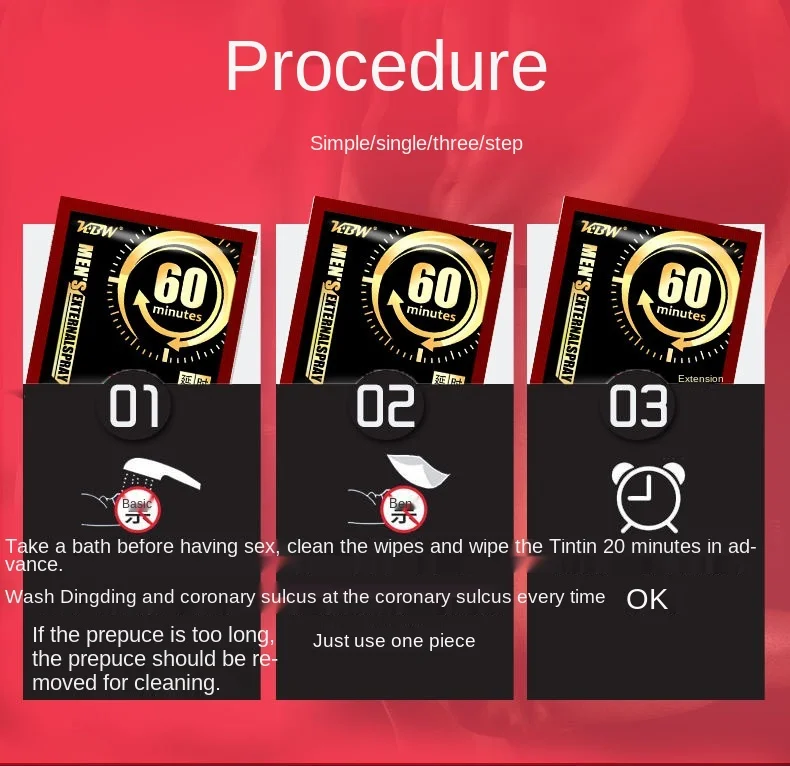 Использование:30 минут до секса используйте продукты для очистки пениса и коронарного канава, пожалуйста, не протирайте отверстие уретры, используйте 1 шт. в течение 1 времени