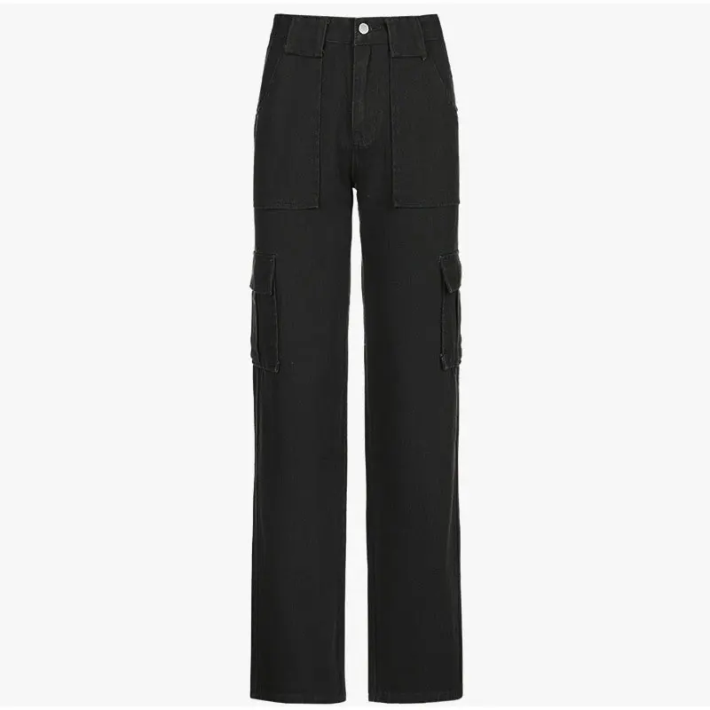 Винтажные черные джинсы-карго Y2k с низкой посадкой, женские свободные джинсовые брюки в стиле Харадзюку с большими карманами, прямые уличные джинсы с широкими штанинами