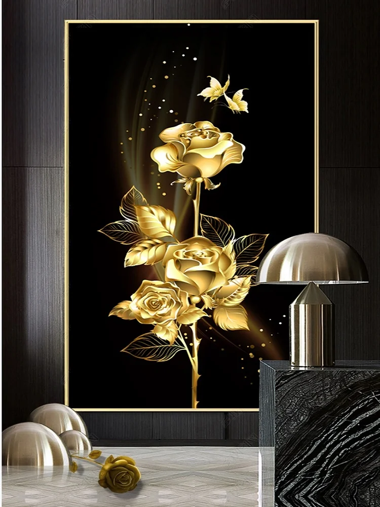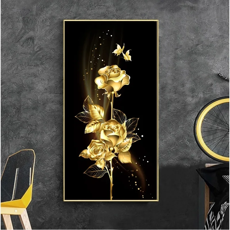 Картина маслом на холсте с изображением розы, абстрактные черные и золотые листья, дерево, настенное украшение для гостиной, плакаты с бабочками