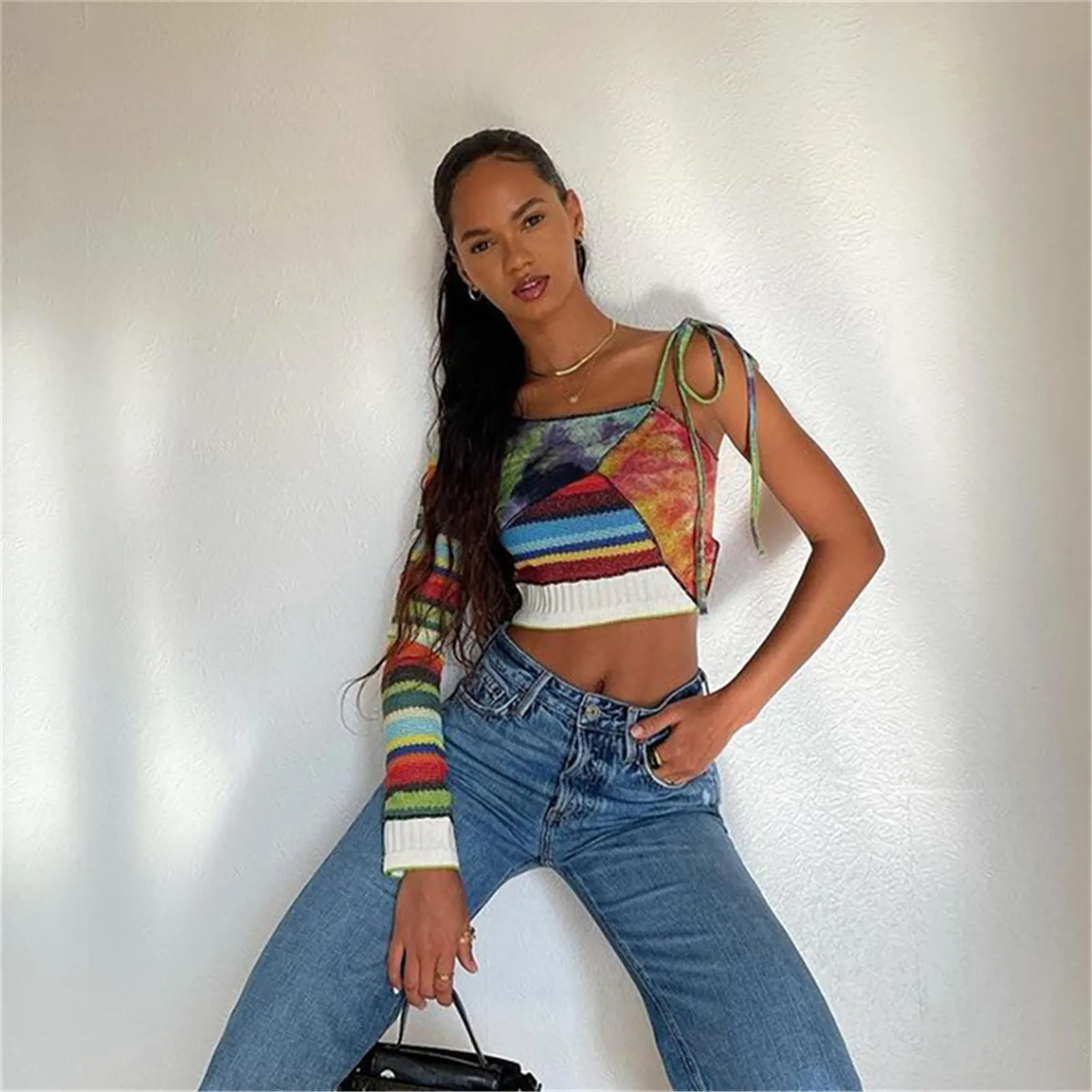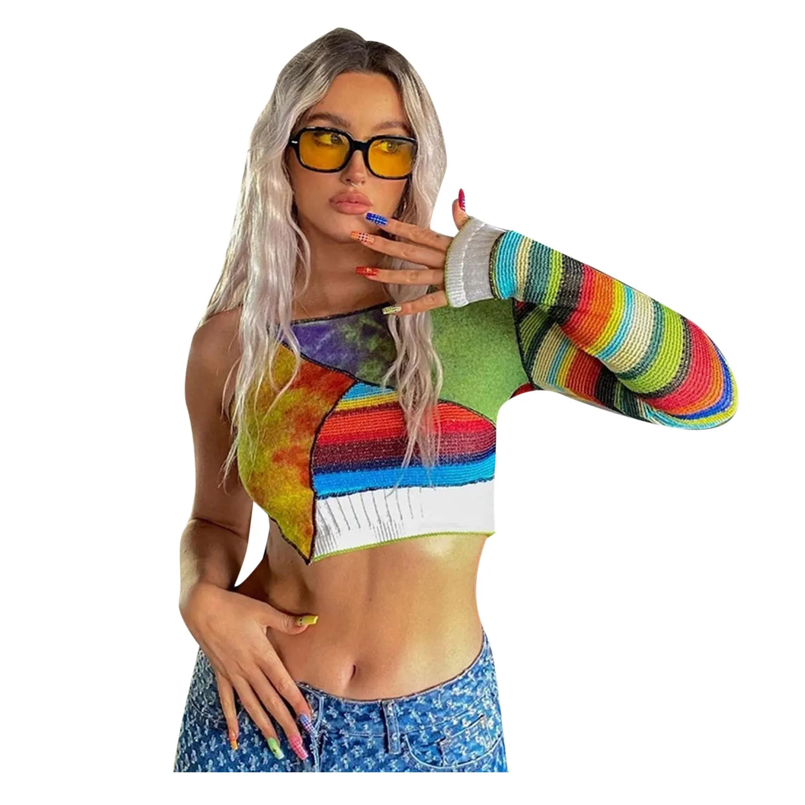 Осенние сексуальные женские топы, модный вязаный жилет с одним рукавом, топ с открытыми плечами, кофта, жилет с цветочным принтом в полоску, блузка, новинка 2021