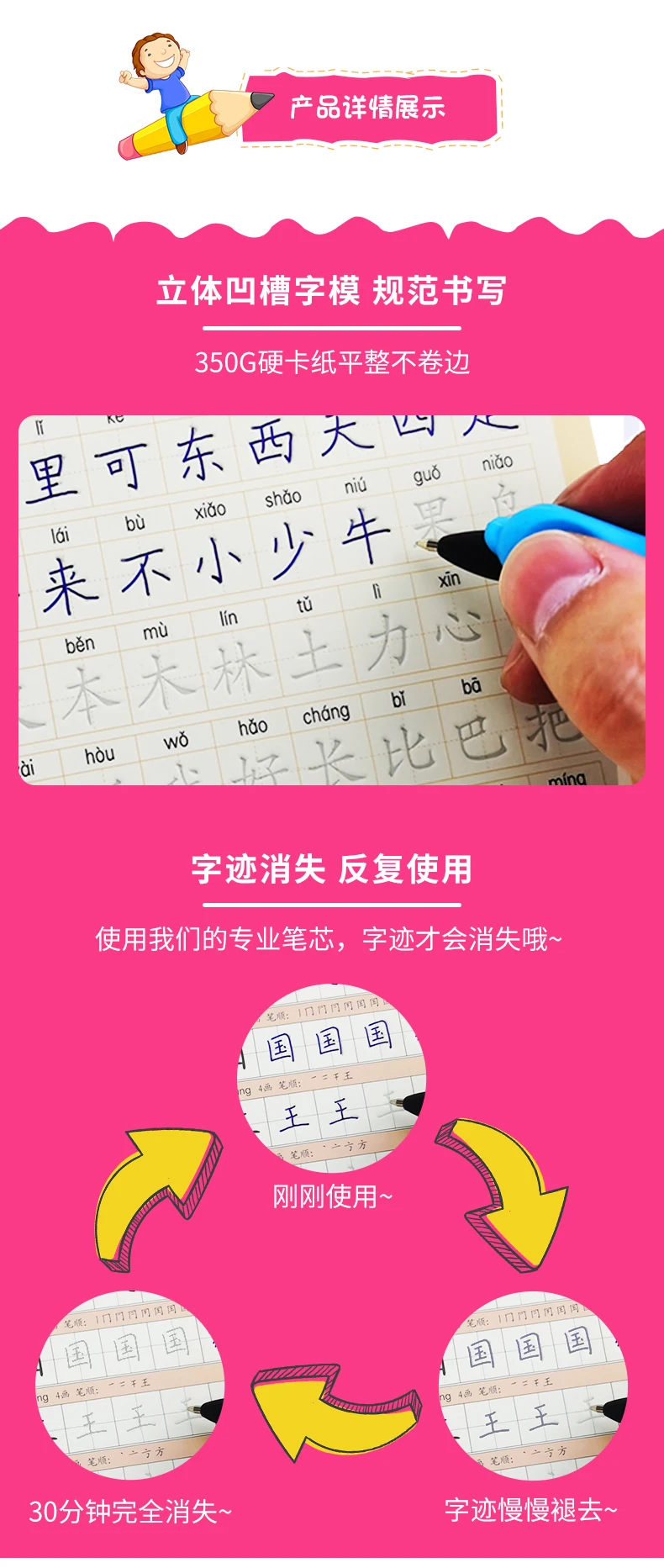 Описание:2020 новая версия синхронной волшебной каллиграфии для учеников начальной школыРазмер: 26*18,5 смВолшебное пополнение, повторное письмоКласс 1-2 (персональное образовательное издание)До: новые слова в классах 1-2, Классические выдержки из трех символовНазад: «Ожидание кролика», «Li Kong Rong Rang» и другие истории.Класс 3-4 (персональное образовательное издание)Положительный: новые слова для классов 3-4Назад: Quatrains, Liu Yong и другие истории5-6 класс (издание народного образования)Положительный: новые слова, синонимы и антониммы 5-6 классовНазад: История Dizi, Ghost Idiom иПодходящий возраст: 6-18 летЯзык китайскийМатериал: белый картонМы использовали волшебную ручку для письма. После написания в течение определенного периода времени шрифт исчезнет и вернется в исходное состояние, которое можно использовать повторно.Примечание: Из-за ручного измерения допускается погрешность в 1-3 мм в фактическом размере! Спасибо!Из-за разрешения, яркости, контрастности и других причин экрана компьютера фактический цвет может немного отличаться от изображения.Если у вас есть какие-либо вопросы, пожалуйста, свяжитесь с нами, прежде чем оставить плохой отзыв, мы постараемся сделать все возможное, чтобы служить вам, спасибо за понимание!Надеюсь, у вас есть хорошие покупки!Примечания:Обложка этого продукта была изменена, но внутренние страницы все равно совпадают