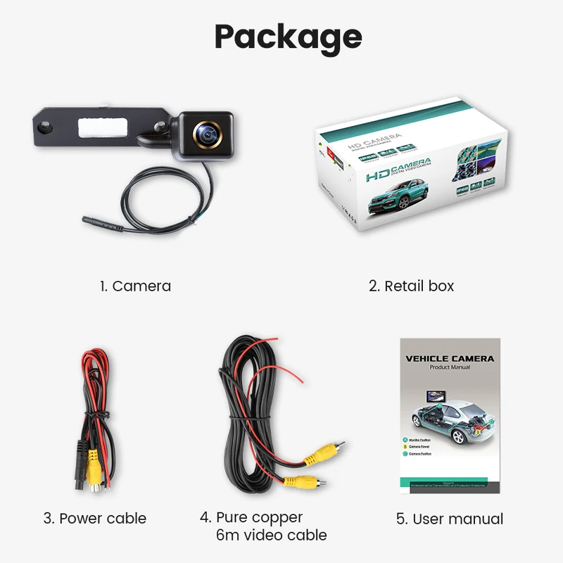 1. Камера заднего вида2. Розничная коробка3. Кабель питания4. Чистый медный 6 м видео кабель5. Руководство пользователя