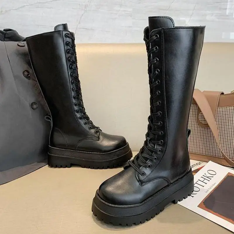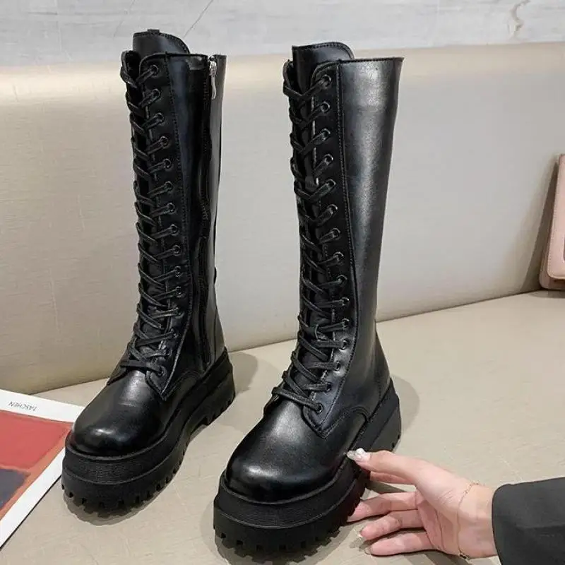 Женские ботинки до бедра, мотоциклетные ботинки на танкетке, на шну...