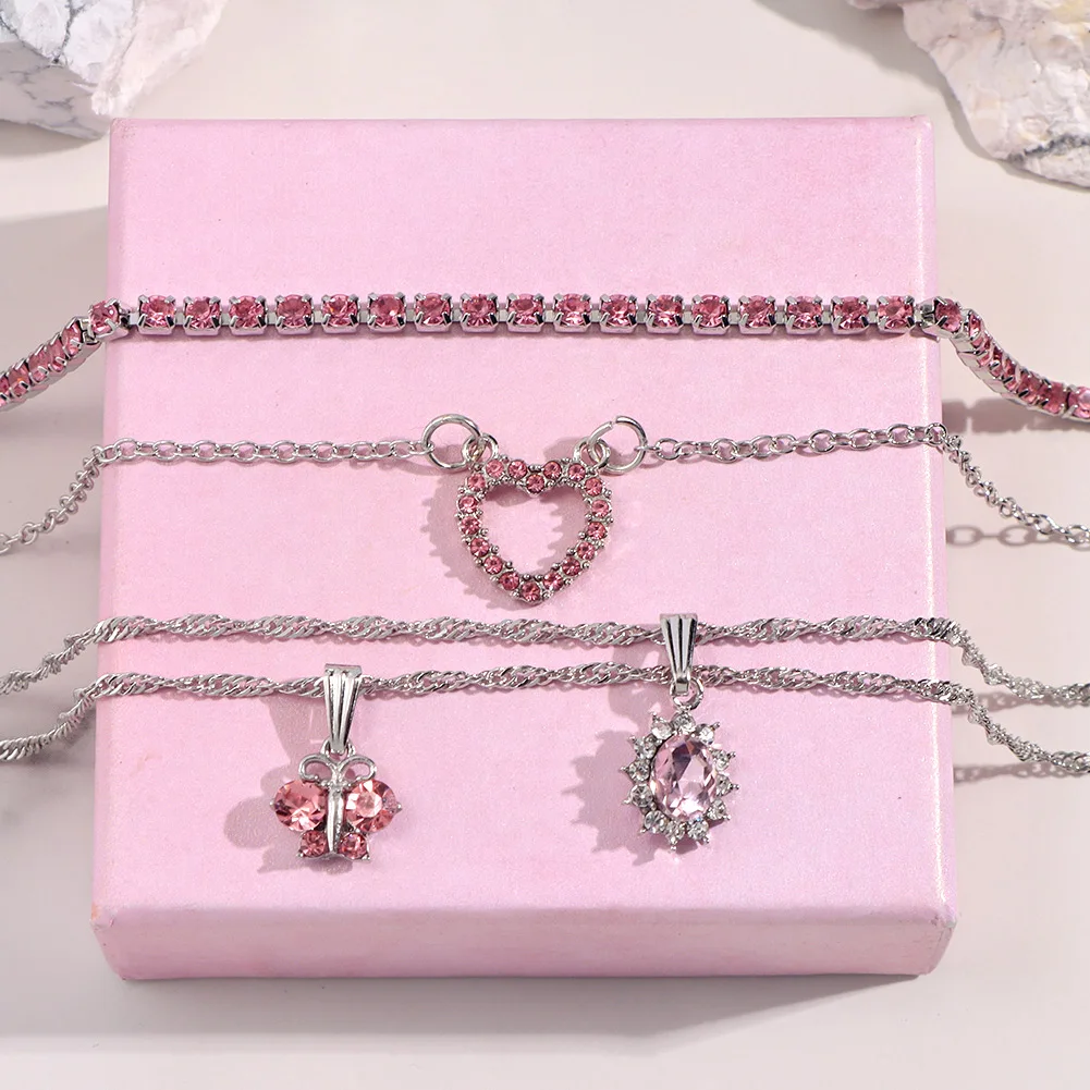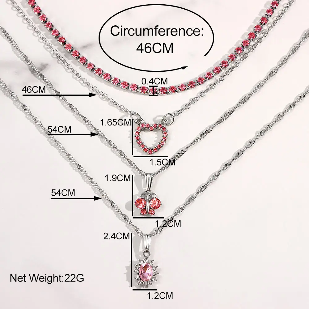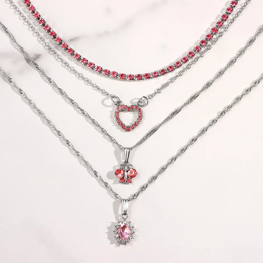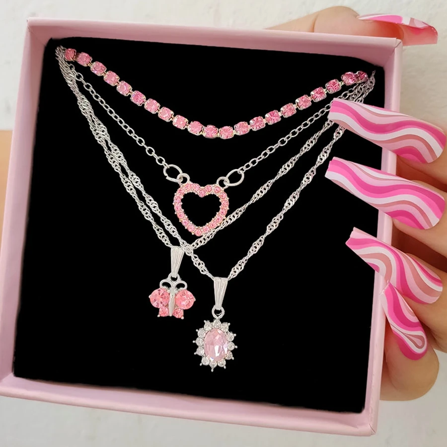 Женское многослойное ожерелье Flatfoosie, ожерелье с кулоном в виде РОЗОВОГО СЕРДЦА, цепь в стиле бохо, Бабочка, стразы, теннисная цепь, ювелирные изделия