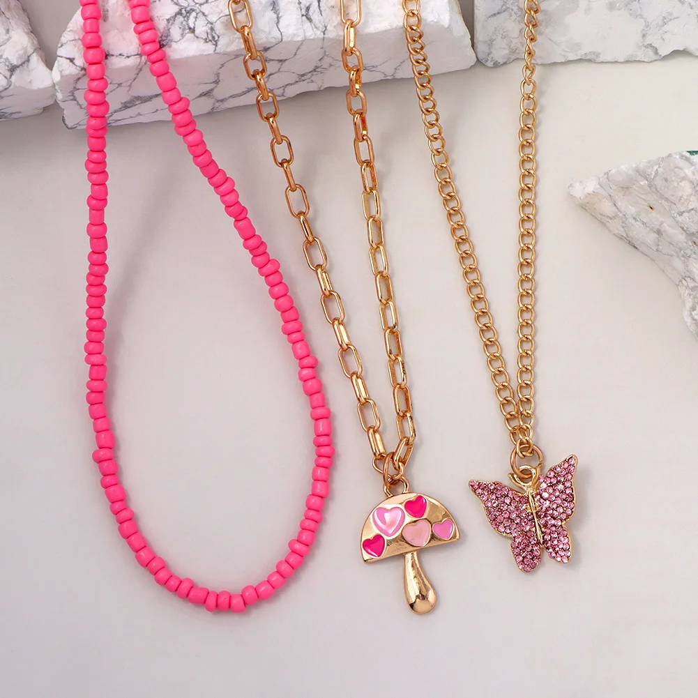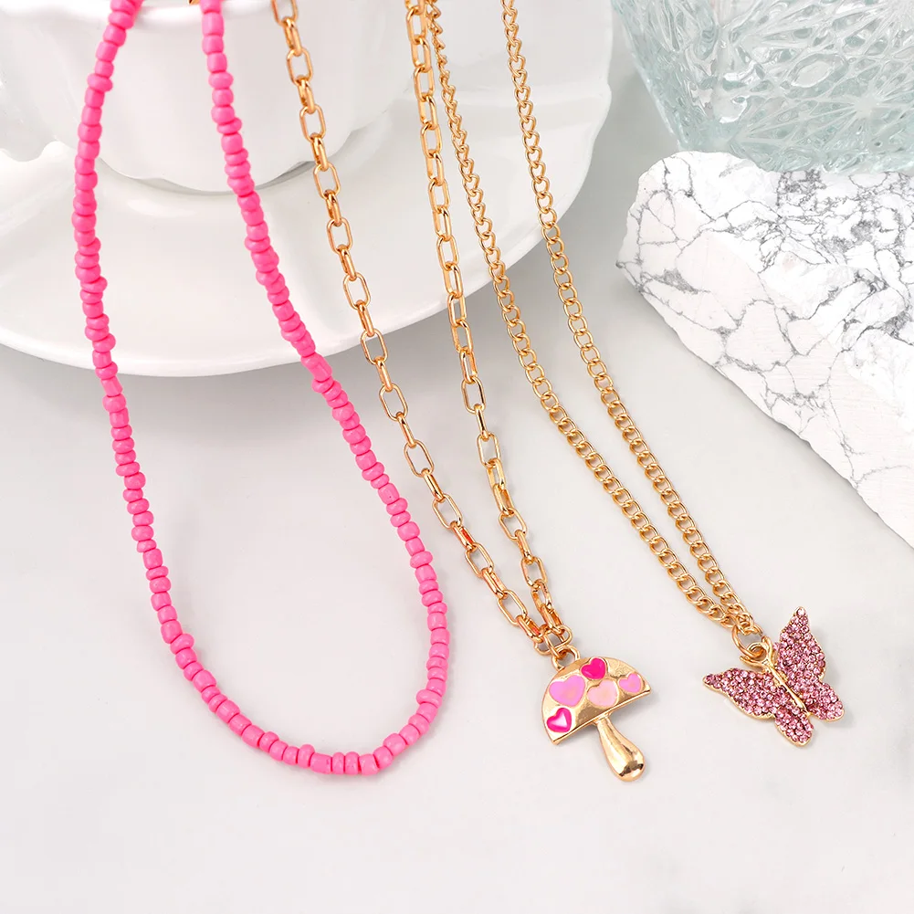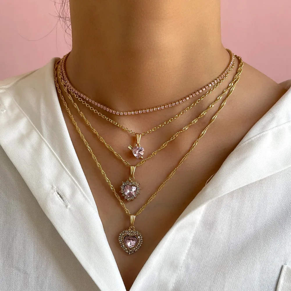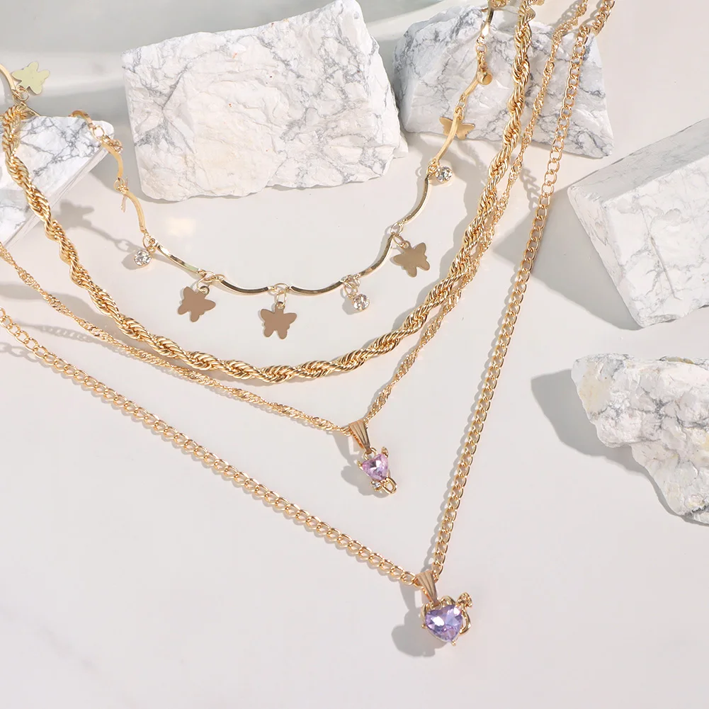 Женское многослойное ожерелье Flatfoosie, ожерелье с кулоном в виде РОЗОВОГО СЕРДЦА, цепь в стиле бохо, Бабочка, стразы, теннисная цепь, ювелирные изделия