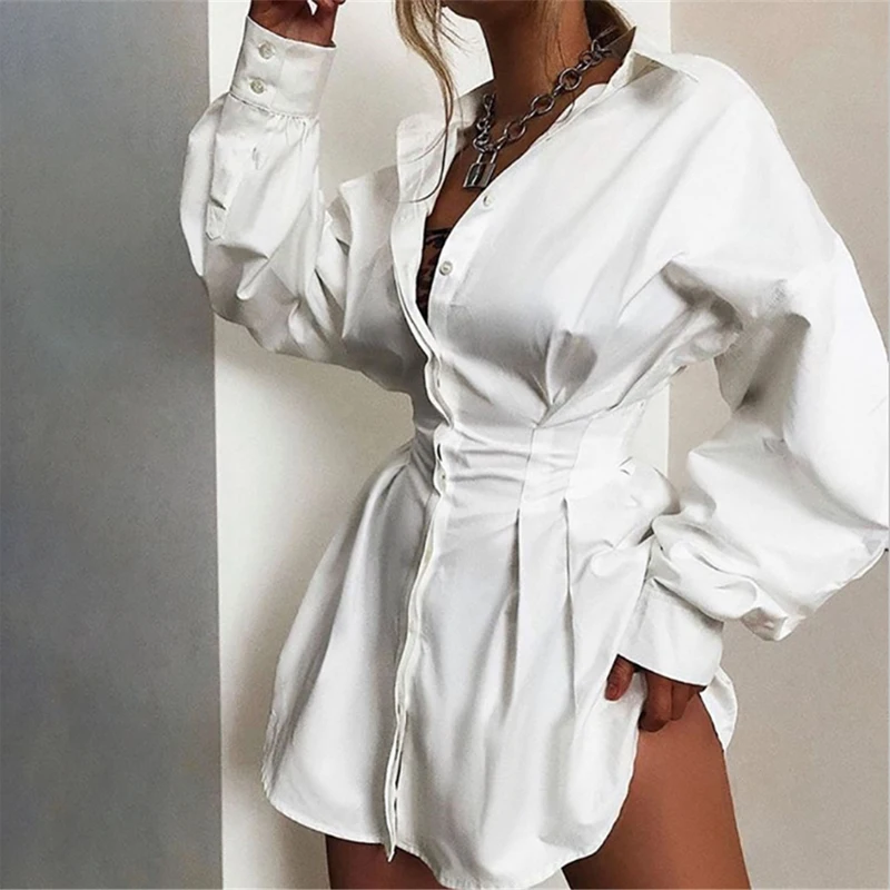 Мини-платье женское с длинным рукавом, пикантная рубашка с глубоким V-образным вырезом, на пуговицах, с рукавом-фонариком, однотонная офисная одежда, на осень