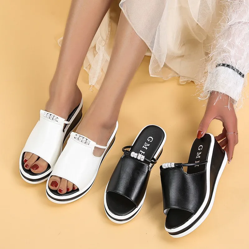 Женские сандалии на танкетке, элегантные кожаные шлепанцы с открытым носком и кристаллами, летние пляжные тапочки, 2021