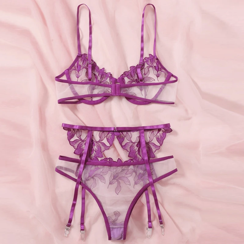 Комплект женского эротического нижнего белья из 3 предметов, пикантное нижнее белье с вышивкой, кружевной Эротический бюстгальтер, подвязки и трусики, прозрачное экзотическое нижнее белье