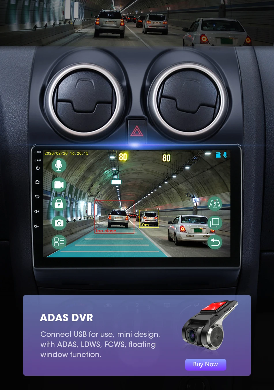 Поддерживает подключение к видеорегистраторУ ADAS. ADAS DVR имеет несколько встроенных ассистивных технологий вождения, вставляя высококачественную карту памяти TF для записи каждого момента вашего вождения.