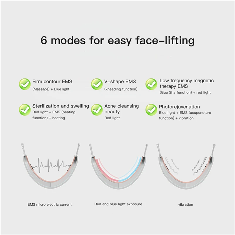 Перезаряжаемый портативный массажер для лица V уход за лицом подтяжка подбородка уменьшение морщин светодиодный Фотон терапия массажер для похудения лица Вибрационный массажерОсобенности:1. Легкий корпус + дизайн для лица, эстетический дизайн лица, подходит для поверхности кожи, регулируемый бандаж свободно корректирует размер в соответствии с формой лица, носить без ограничений2. Приятный для кожи силикон, подходит для лица более комфортно.3,6 легко тонкое лицо в большом режиме:Прочный контур: EMS (функция Tuina) + синий светильник.V-образная Форма: EMS (функция разминания).Низкочастотная Магнитная терапия: EMS (функция Gua Sha) + красный светильник.Стерилизация и отек: Красный светильник + EMS (функция биения) + нагрев.Красота от акне: Красный светильник.Фотонное омоложение: синий светильник + EMS (функция акупунктуры) + вибрация.EMS микро-ток стимулирует выработку атр, стимулирует подкожную клетчатку человека, улучшает эластичность мышечного волокна лица, активирует активность коллагена и подтягивает кожу;Красный светильник очищает, стерилизует, защищает кожу и укрепляет поглощение и ремонт кожи, сбалансирует масло кожи, отбеливает пятна и уменьшает поры;Синий светильник улучшает активность клеток кожи, способствует метаболизму, улучшает кровообращение, повышает эластичность кожи, омоложение кожи и удаление морщин, предотвращает старение и окисление;Вибрация подтягивает лицевые мышцы, поднимает и формирует.4. Запуск одной кнопкой, простая эксплуатация и удобное использование.5. Складная конструкция, легко носить с собой.6. 6 регулировки зубчатой передачи для удовлетворения различных групп людей:1-2 шестерни подходят для нового контакта с изделием, для людей, которые более чувствительны к стрессу и имеют тонкие кутикулы.Уровни 3-4 подходят для использования продукта в течение 2-3 недель, ориентированы на людей с умеренным стрессом, гипертрофией массажера и двойным подбородком.Уровни 5-6 предназначены для людей, которые использовали продукт в течение более 3 месяцев, сильно напряженных и широких и плоских mandibles.7. Оснащен парой гелей, чтобы лучше почувствовать комфорт, вызванный EMS микро-током.Спецификация:Материал: АБС + силиконМощность: 3,5 WНапряжение зарядки: DC3.5-5.0VЕмкость аккумулятора: 750 мАчВремя зарядки: около 4 часов (при зарядке светильник индикатора всегда красный, а светильник полного индикатора выключен)Время использования: около 3 часов непрерывного использованияТемпература горячего сжатия: 42 ℃ ± 2 ℃Режимы: затягивание контура, v-образная форма, низкочастотная магнитная терапия, стерилизация и уменьшение отеков, очищение акне, фотоомоложениеПоложение шестерни: 6 передачТерапевтический светильник: синий светильник, красный светильникДлина шнура питания: 44 см ± 2 смПосылка:Лицевое подъемное устройство * 1Руководство * 1Шнур питания * 1Пульт дистанционного управления * 1Регулируемый бандаж * 1Гель * 1 пара