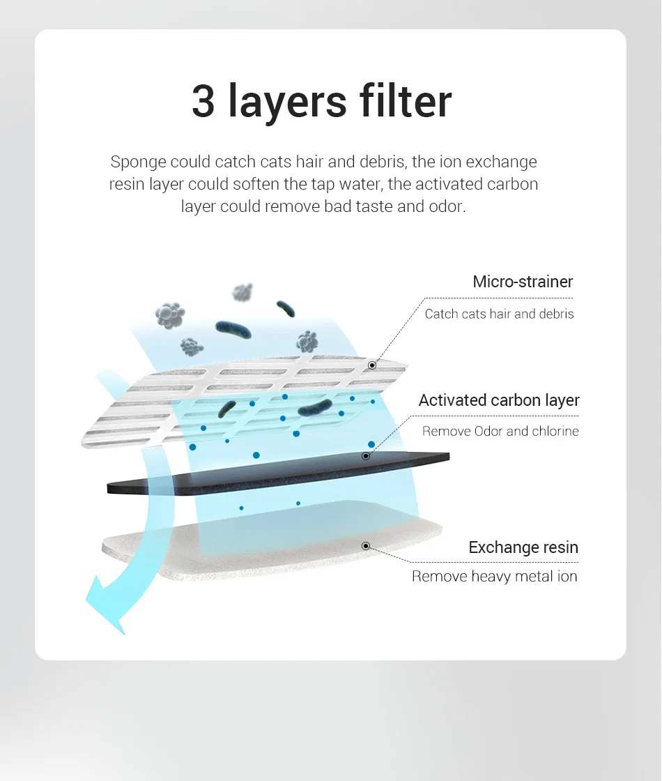 Уникальный сменный дизайнерский фильтр эффективно фильтрует волосы, запах и хлор. Следовательно, фонтан может дать чистую воду для домашних животных и уменьшить риск развития болезни. Угольный фильтр помогает удалить запахи и плохой вкус.